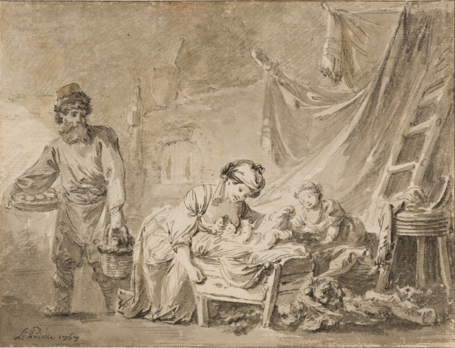 In December 1764, Le Prince announced the publication of a series of thirty-six prints made from his drawings (‘5 suites d’Habillemens d’après le figures dessinées en Russie’), followed by a further group of etchings issued the year after, and others in 1767 and 1768. (Other printmakers, such as Gilles Demarteau and Louis-Marin Bonnet, also produced engravings of Russian subjects after his drawings.) Elected to the Académie Royale in 1765 with a genre painting entitled The Russian Baptism, Le Prince exhibited fifteen paintings of Russian subjects at the Paris Salon of that year. At around the same time he provided thirty-two drawings to illustrate the Abbé Jean Chappe d’Auteroche’s Voyage en Sibérie, published in 1768. In the preface to the book, Chappe wrote, ‘The drawings which accompany the descriptions of local customs are by Monsieur Le Prince, of the Academy of Painting: one sees by the beauty of his compositions, the richness of his imagination, and his rare talent for drawing costumes and nature, that he has studied in Russia.’ Le Prince’s drawings for the Voyage en Sibérie have been described as ‘among his most significant works…Highly finished and minutely detailed, the exotic images in the Voyage drawings provide a vocabulary for virtually all of the artist’s later work.’