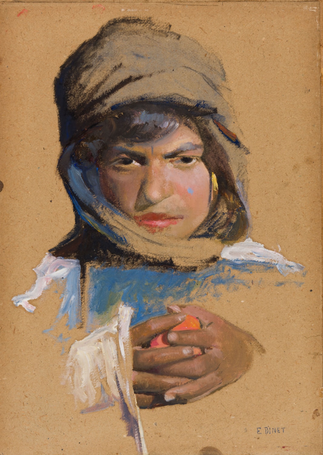 Alphonse-Étienne Dinet was a pupil of Victor Galland at the Ecole des Beaux-Arts, as well as William-Adolphe Bouguereau and Robert-Fleury at the Académie Julian. He exhibited at the Salons between 1882 and 1889, and at the Société Nationale des Beaux-Arts between 1890 and 1921. In 1884 Dinet won a travel scholarship to Algeria, followed by another the next year. He was to return often to the country, which he soon regarded as a second home, and immersed himself in the local culture. He spent up to nine months a year there, and in 1904 bought a home in the town of Bou-Saada in southern Algeria. Admitted to the Légion d’Honneur in 1886, he won a silver medal at the Exposition Universelle of 1889 and a gold medal at the Exposition Universelle of 1900. In 1893 Dinet was among the founder members of Société des Peintres Orientalistes.
