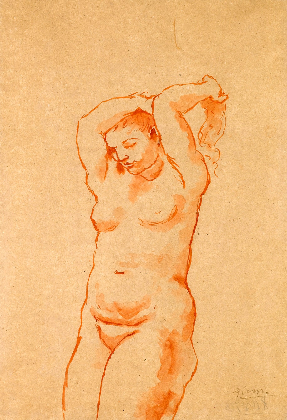 The theme of a woman combing or arranging her hair was one that Picasso began to consider in 1905, and which he developed in several paintings and drawings over the next year. His lover Fernande Olivier had long auburn hair and Picasso became engrossed in watching her daily ritual of arranging her coiffure; an allure that soon found its way into his art. As Josep Palau i Fabre has written, ‘Then there is another theme, which had been in Picasso’s mind for over a year, and which he had already been developing in Paris before going to Gósol: that of women’s hair, dressed or being dressed. The sensual quality of a woman’s hair, falling loosely or held up by a hand, continued to fascinate him.’ The raised arms of the model in this drawing is another motif common to several works of this date. As another scholar has observed, ‘The hand raised to the hair is a convention that Picasso explored repeatedly in 1906...It is a gesture common to the toilette or coiffure motif and to classical subjects like the Venus Anadyomene, where an idealized nude wrings her hair as she emerges from the sea.’ Fernande’s voluptuous figure, facial features and red hair may be perceived in this striking drawing, which employs the reddish tonality that is such a characteristic feature of Picasso’s works of the late Rose period.