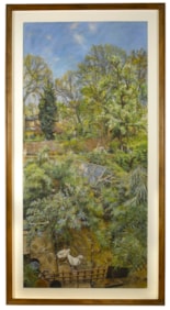 This very large and impressive sheet, drawn in the spring of 1996, is a remarkable tour de force of pastel and watercolour, and depicts the view from the artist’s studio in Richmond. It is the last and largest of three related works of the same title and subject, the other two having been drawn and exhibited the previous year; all three are tall and narrow compositions. In more general terms, this monumental drawing belongs with a large group of paintings and pastels, executed in the second half of the 1990’s, focusing on the angled view from the artist’s studio window down into his garden, here depicted with its ducks and greenhouse with, in the middle distance, a fence and beyond a glimpse of a neighbour’s garden, with a child on a swing. The brightness and intensity of the colours in the present sheet, with the garden depicted in sunshine, is unusual in Bramham’s work, in which a more subdued tonal palette usually predominates.