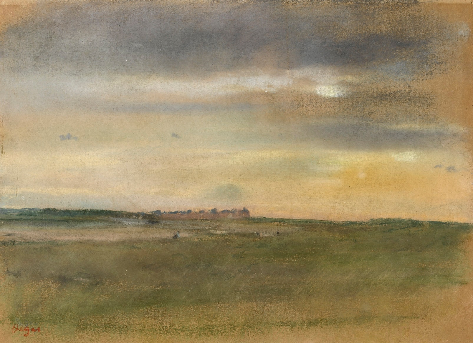 The Normandy landscapes of 1869 represent Degas’s first consistent use of pastel, which by the 1880’s was to become his preferred medium. He seems to have found the medium to be an ideal means of capturing transient effects of light and atmosphere in a landscape, something he had not always been able to achieve before. As Kendall writes, ‘In the late 1850s, Degas had struggled with pencil, ink and watercolour to translate his perceptions into two-dimensional imagery, adding vividly written summaries of changing light and weather conditions. Now, he could use the medium of pastel, combining the effects of colour, line and tone in a single process that almost kept pace with his perceptions. With pastel, he could scatter powdery hues across the paper to indicate coffee-coloured sand or silvery-green sea…With pastel, too, he could respond to the finest nuances of the atmosphere, working rapidly as wind and weather began to change.’ In works such as this and the previous sheet, Degas applied the pastel lightly over the warm tones of the pale brown paper, which he left to show through in places, thus adding to the atmospheric qualities of the scene.