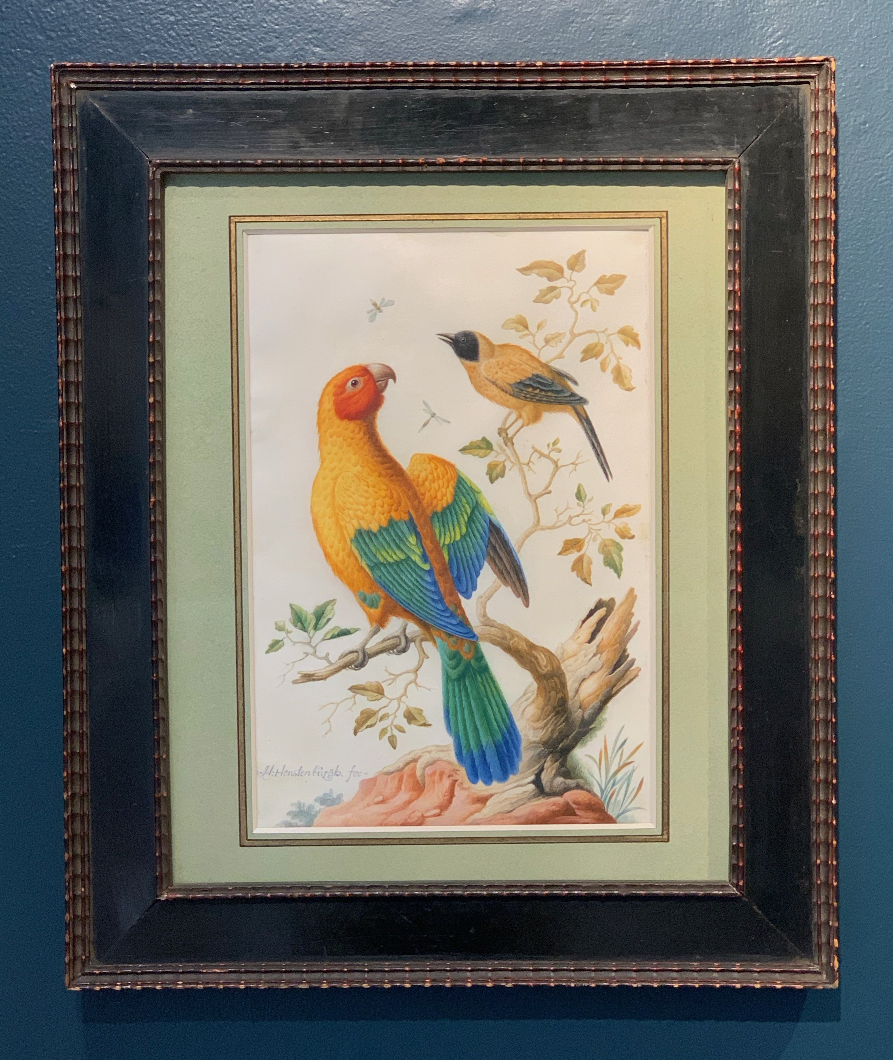 The smaller bird would appear to be a Yellow-backed Oriole (Icterus chrysater), native to Central America and northern South America. It is interesting to note that Henstenburgh has here depicted the oriole seemingly in the act of catching insects. Since the bird is indeed insectivorous, this would imply that the artist was perhaps working from a live specimen that he had studied closely. The presence of a Yellow-backed Oriole in this drawing is also unusual in that the species was not formally named and described until over a hundred years later, in the 1840s. The present sheet, therefore, not only serves as an accurate record of two rare and valuable South American birds, but may perhaps also reflect a thriving contemporary market for such exotic creatures.