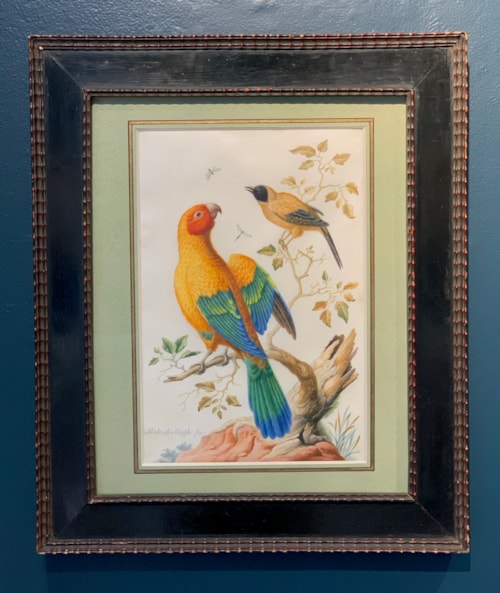 The smaller bird would appear to be a Yellow-backed Oriole (Icterus chrysater), native to Central America and northern South America. It is interesting to note that Henstenburgh has here depicted the oriole seemingly in the act of catching insects. Since the bird is indeed insectivorous, this would imply that the artist was perhaps working from a live specimen that he had studied closely. The presence of a Yellow-backed Oriole in this drawing is also unusual in that the species was not formally named and described until over a hundred years later, in the 1840s. The present sheet, therefore, not only serves as an accurate record of two rare and valuable South American birds, but may perhaps also reflect a thriving contemporary market for such exotic creatures.