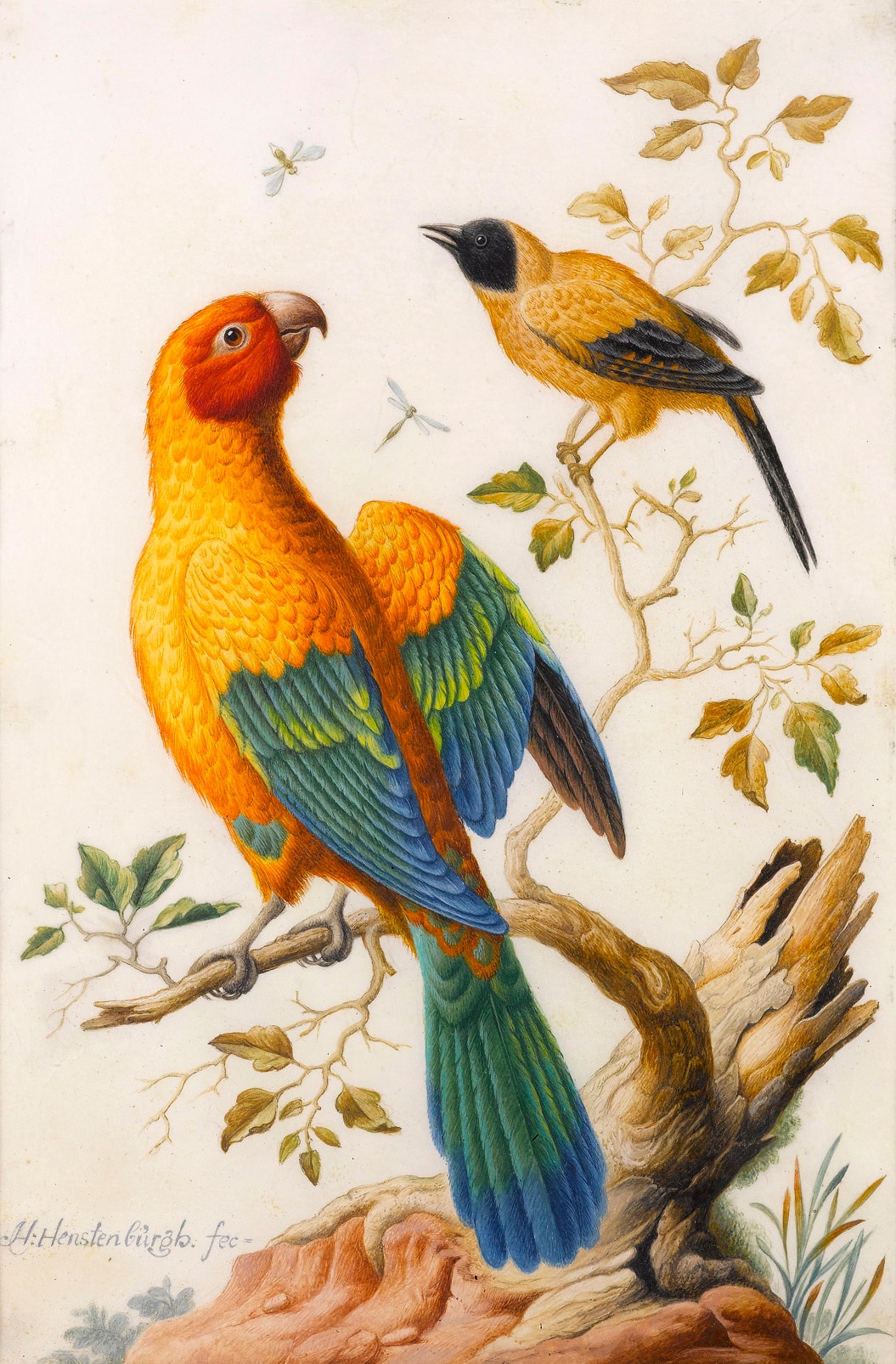 The larger of the two birds may be identified as a Sun Conure parrot (Aratinga solstitialis), a species native to areas of the north-eastern part of South America, in particular northern Brazil and Guyana. The parrot, which grows to an average of thirty centimetres in length, is described in ornithological literature from the 1730s onwards, although specimens must have been in circulation in Europe somewhat earlier. Long popular in Europe as captive pet birds, the severe decline of its population has meant that the Sun Conure is today listed as an Endangered species. Although Henstenburgh may have been working from a preserved specimen, it is equally likely that this watercolour was based on a live bird, since Sun Conure parrots were already established in Europe as expensive pets by the end of the 17th century.
