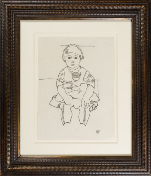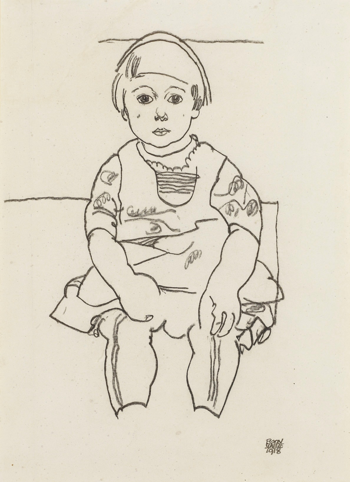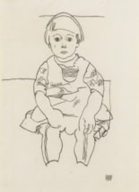 The present sheet is one of only three known portrait drawings of Schiele’s young nephew to date from 1918. Of the other two drawings, likewise drawn in black crayon alone, one shows him seated on his mother’s lap, while in the other he is shown in much the same way as in this drawing, seated and facing forward. This is indeed how he appears in Schiele’s painting of 1918, which was left unfinished at the artist’s death in October of that year. In the painting, as in the present sheet and other drawings of the young Toni Peschka at the age of two or three, the child is depicted wearing a dress, which was not uncommon for small boys at that time.
