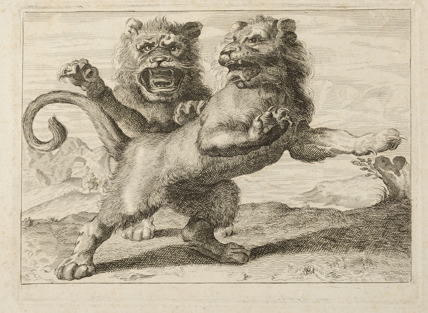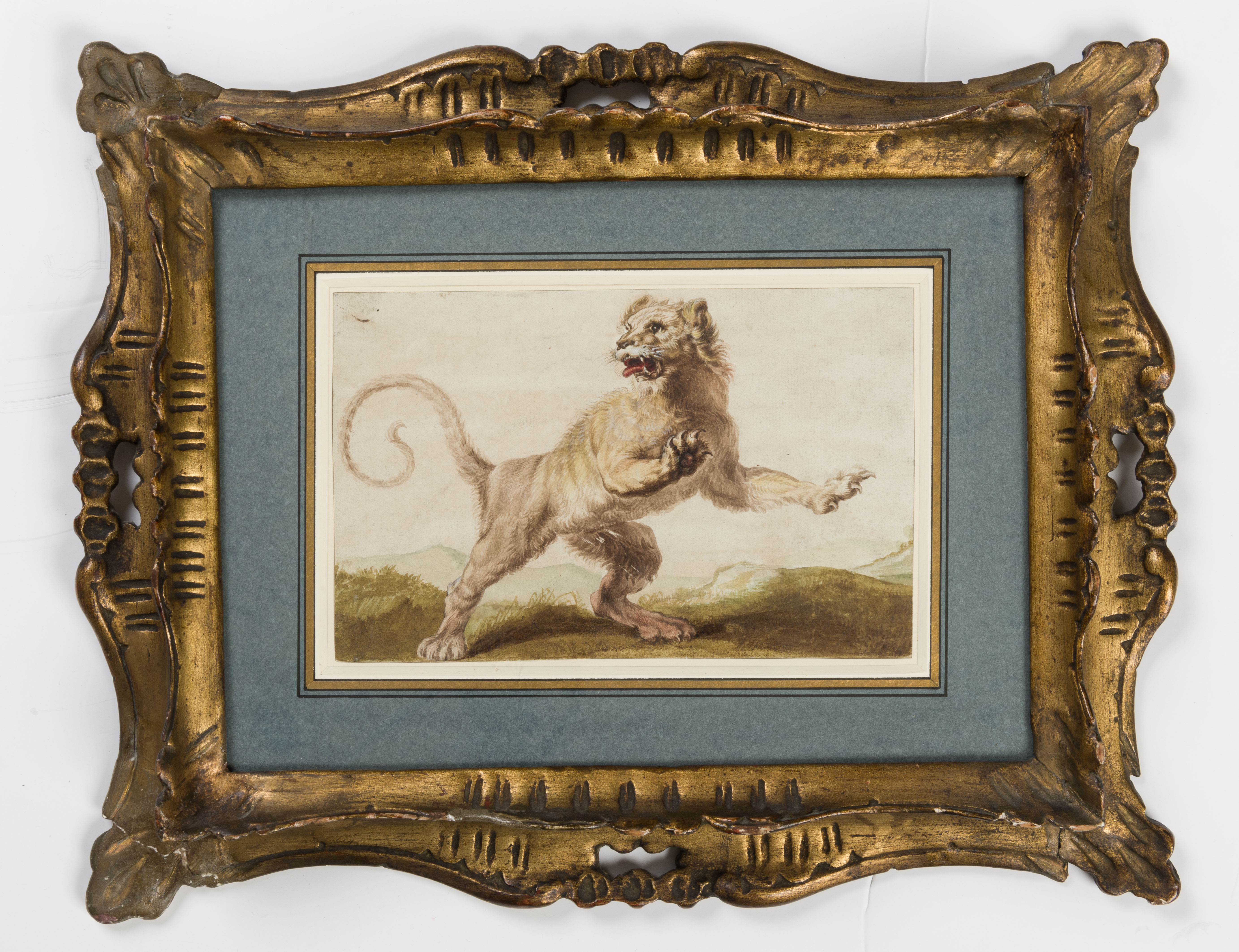 The traditional attribution of the present sheet to Carl Andreas Ruthart, while tentative, would seem to be worth considering in light of the artist’s penchant for leaping animals in his paintings. The lion depicted in this drawing is based, in reverse, on part of an etching of two young lions at play by Abraham Blooteling after Peter Paul Rubens. Blooteling’s print is one of a set of four etchings of lions, each after designs by Rubens, published as Variae Leonum Icones sometime in the second half of the 17th century. The draughtsman may have been derived his composition from Blooteling’s print, or a contemporary, reversed copy of it. The same lion was used by Frans Snyders in a painting of Two Lions Pursuing a Roebuck of c.1620-1625, today in the Alte Pinakothek in Munich, and for a painting of The Lion and the Mouse of about the same date, at Chequers Court in Buckinghamshire.