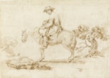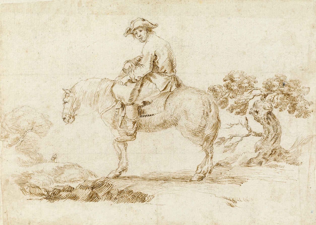 A closely comparable pen and ink drawing of a horseman at a fountain, probably drawn in Rome, is in the collection of the Louvre, and was later used for an etching from the series Diverses figures et griffonnemens of c.1646. Among other drawings of similar subjects by Della Bella is a sheet in the Czartorsyki collection at the National Museum in Krakow, which is in turn related to one of a series of etchings of peasant subjects first published around 1641, and a drawing of a peasant seated on a mule in the Istituto Nazionale per la Grafica in Rome. Two related subjects among Della Bella’s etchings can also be found in the series of Diversi capricci of c.1647.