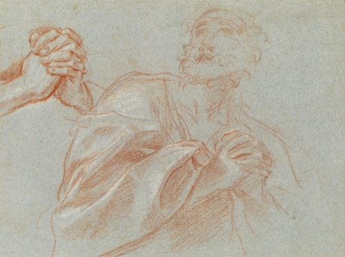 In his posthumously published life of the artist, Giovan Pietro Bellori notes that, even as a young artist, Maratti’s skill as a draughtsman was readily apparent: ‘his drawings were already held in great esteem because there was no one who equaled him, and Bernabeo [his elder half-brother] was earning no little profit from them, frequently selling them to foreigners interested in painting, because the skill of a master was apparent in them...’ Maratti’s drawing style differed from that of his master Sacchi in his preference for a more robust definition of form over the softer, more colouristic approach of the elder artist. A prolific draughtsman, he had a preference for red chalk, and made numerous studies of drapery, anatomy and pose for each of his paintings.