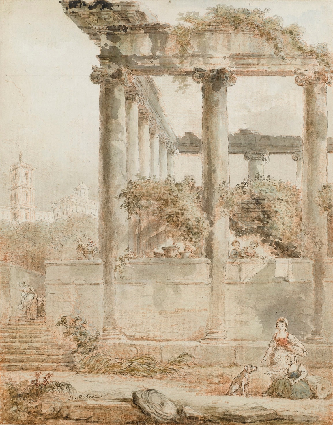 A student of the sculptor Michel-Ange Slodtz, Hubert Robert travelled to Rome in 1754 in the retinue of the new French ambassador to the Vatican, the future Duc de Choiseul. It was probably through the influence of Choiseul that, although he was not officially a pensionnaire at the Académie de France in Rome, the young Robert was able to study there for several years. Succinctly described by the director of the Académie de France, Charles-Joseph Natoire, as a young man ‘who has a penchant for painting architecture’ (‘qui a du goût pour peindre l’architecture’), Robert spent a total of eleven years in Italy, mostly in Rome. He fell under the particular influence of Giovanni Paolo Panini, the leading Italian painter of architectural views and capricci, who taught perspective at the Académie de France. Robert’s earliest paintings and drawings, both in composition and technique, are greatly indebted to the example of Panini. At the Académie de France Robert met and befriended Jean-Honoré Fragonard, and with him made sketching tours of the countryside around Rome.