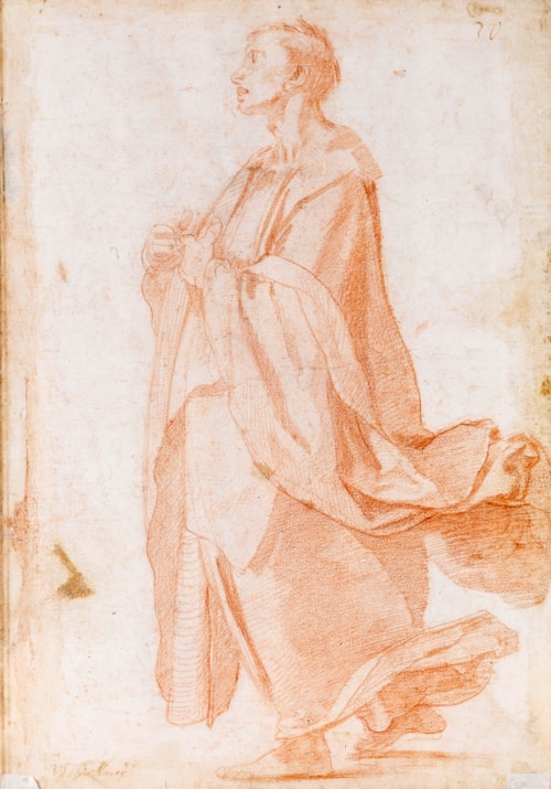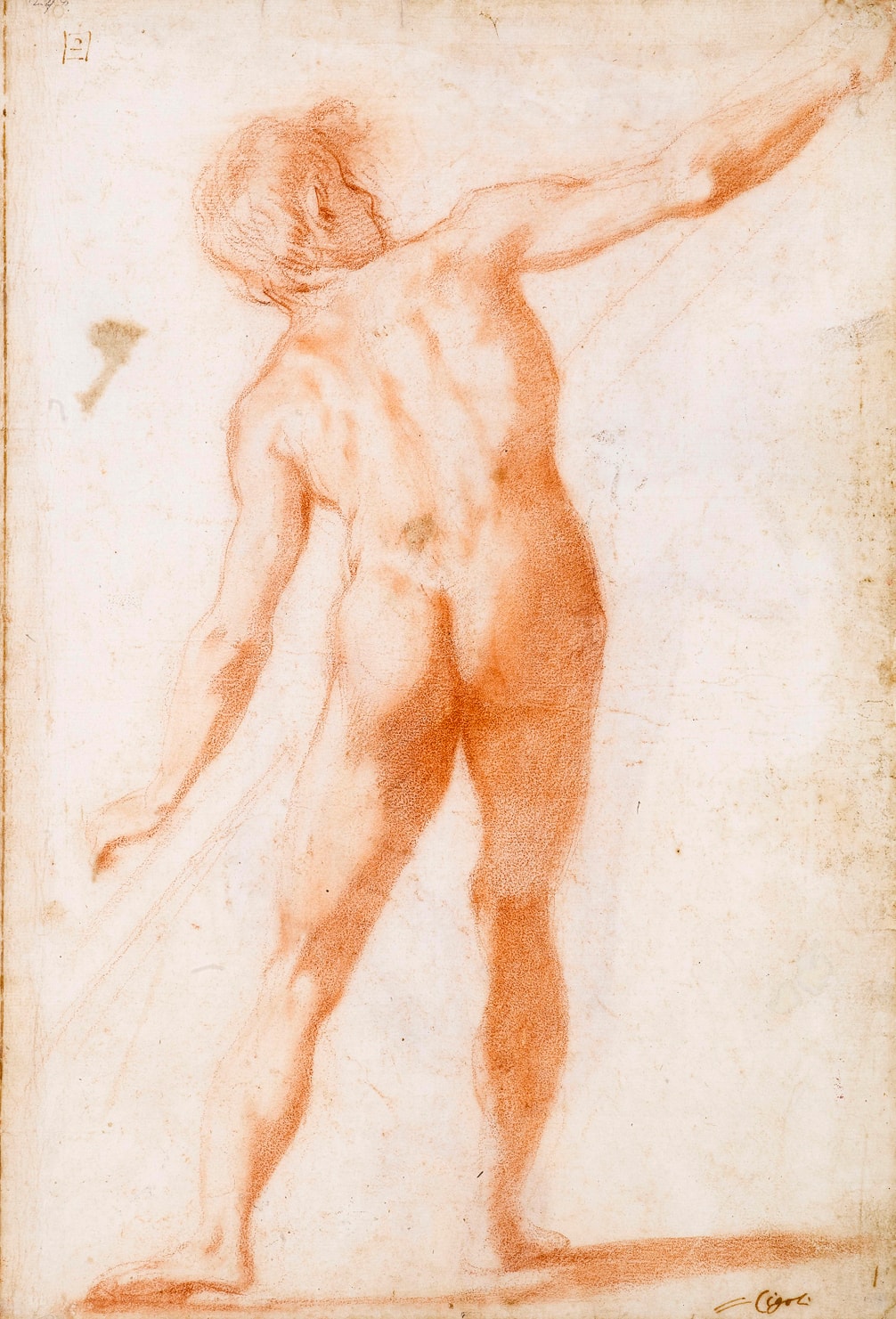 Neither of the figure studies on the recto and verso of this splendid drawing can be definitively related to a surviving painting by Cigoli. Miles Chappell has, however, tentatively suggested that the male nude may be a first idea for the pose of the angel in Cigoli’s altarpiece of The Resurrection, painted in 1590 for the Palazzo Pitti. Long thought to be lost and only recently rediscovered, the painting was one of Cigoli’s first Medici commissions, and marked the beginning of his successful career. The figure of an angel for which Chappell posits this drawing may be a study is in the middle ground of the composition, partially obscured by a soldier. The male nude in this drawing appears to be lifting or holding a rectangular object, only faintly drawn in red chalk, which may perhaps be identified as the tomb slab that the angel lifts in the painting. Chappell has further suggested that the draped figure on the verso of the present sheet may be related to one of the figures in the background of the same painting, an area that is no longer legible due to the poor condition of this part of the canvas.