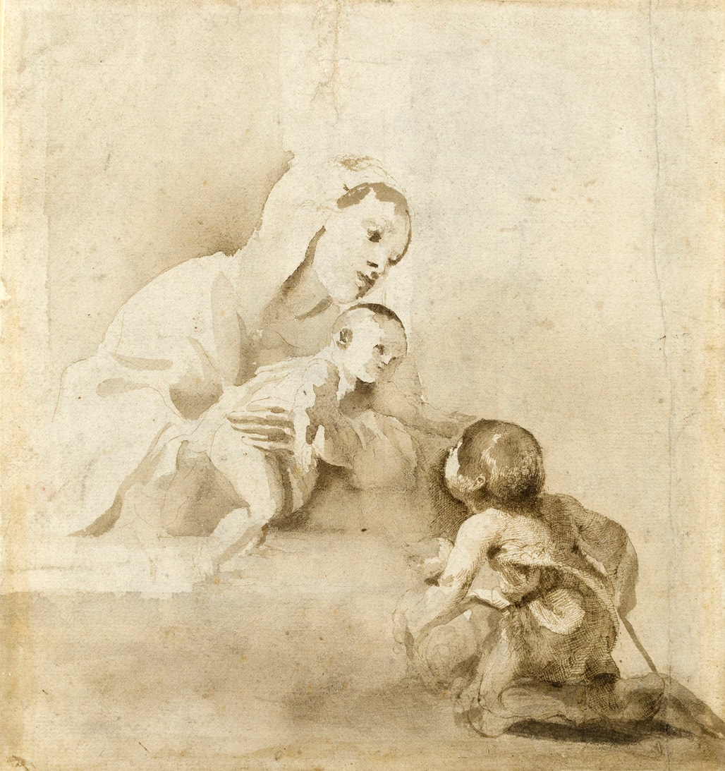 Although unrelated to any surviving painting, the present sheet is a splendid example of Faccini’s confident draughtsmanship. The use of broad areas of fluid wash to create effects of light in contrast to the areas of untouched white paper, as well as the relatively insubstantial forms of the figures themselves, is a characteristic feature of Faccini’s pen draughtsmanship of the late 1590’s. The areas of very fine pen hatching and crosshatching to add depth to the shadows, particularly evident in the drapery of the young Saint John the Baptist, have led to the tentative suggestion that the drawing may have been intended to have been reproduced as a print.