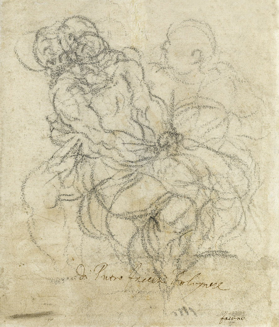 The rapidly drawn study in black chalk on the verso of this sheet may have been intended for a small devotional painting. Indeed, the drawing is close in composition to a late painting on copper by Faccini of Christ Supported by Angels, painted around 1600 and now in a private collection. Other drawings of a similar subject by Faccini, though different in composition, are in the Albertina in Vienna10 and the British Museum.