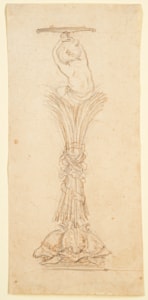 This drawing may be compared stylistically to an ornamental drawing by Della Bella of A Saltcellar in the Form of a Mermaid Holding a Shell in a private collection in Chicago, or a design for a garland in the Louvre. Similar drawings for table ornaments by the artist are in the Louvre, the Royal Collection at Windsor Castle, the Uffizi, and elsewhere. Such fanciful designs may have been intended for decorative objects commissioned by the Medici.