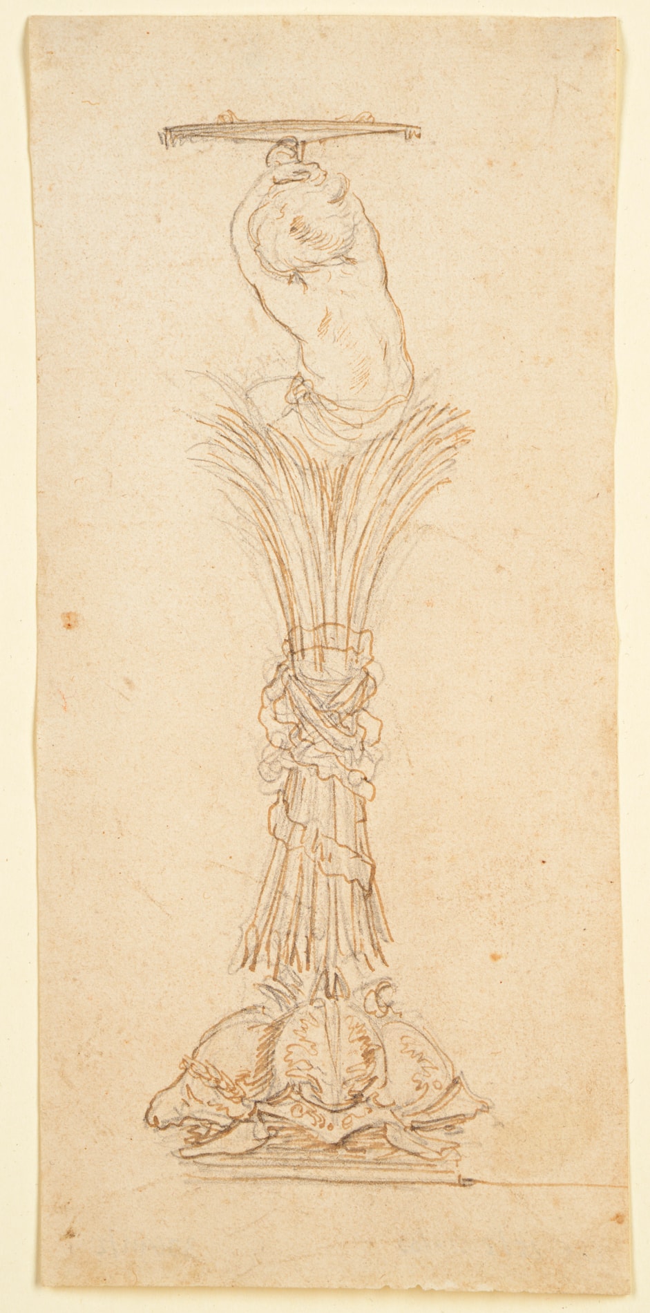Design for a Table Ornament: A Saltcellar(?) in the Form of a Child Resting on a Bundle of Wheatstalks, Holding a Platter