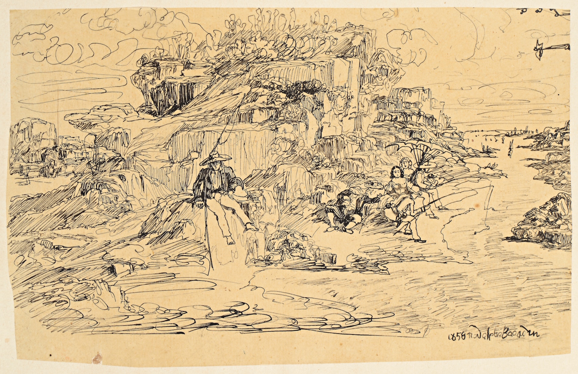 The present sheet is dated 1858, when the artist was living in Toulouse and producing some of the most imaginative and exceptional works of his career. Depictions of fishermen occur occasionally among Bresdin’s drawings and etchings; a comparable small drawing of anglers appeared at auction in Paris in 2014. (The artist himself is known to have fished on the banks of the Garonne river, which runs through the city of Toulouse.) Among other stylistically comparable pen and ink drawings is a Landscape with Smugglers, likewise dated 1858, in the collection of the Art Institute of Chicago.