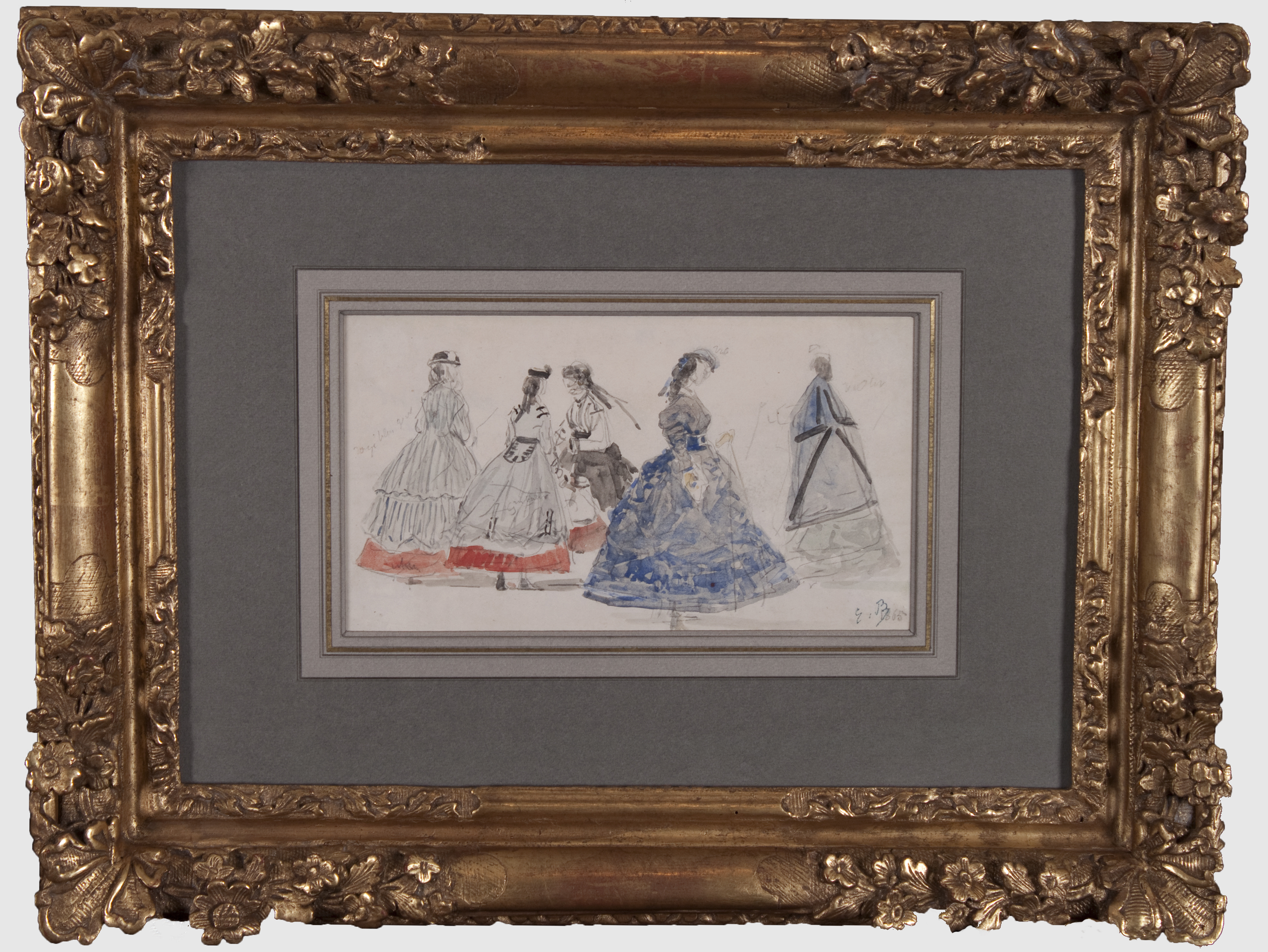 The artist’s biographer Gérard Jean-Aubry has written that ‘Boudin executed a number of pencil sketches of elegant women and fashionable people on the beach. The colours are indicated by watercolour washes, or simply by written notes. These charming sketches form part of the same group as Boudin’s studies of fishermen on the quaysides, or boats in the harbours, but apart from this they constitute as artistically valuable a documentation of the fashions of an epoch as those of Constantin Guys. It is regrettable that all these sketches have been scattered, since a choice of them would have composed a charming album of feminine fashion on the beaches during the heyday of the Second Empire.’