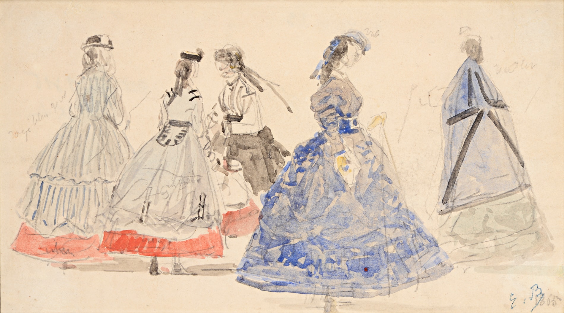 The artist’s biographer Gérard Jean-Aubry has written that ‘Boudin executed a number of pencil sketches of elegant women and fashionable people on the beach. The colours are indicated by watercolour washes, or simply by written notes. These charming sketches form part of the same group as Boudin’s studies of fishermen on the quaysides, or boats in the harbours, but apart from this they constitute as artistically valuable a documentation of the fashions of an epoch as those of Constantin Guys. It is regrettable that all these sketches have been scattered, since a choice of them would have composed a charming album of feminine fashion on the beaches during the heyday of the Second Empire.’