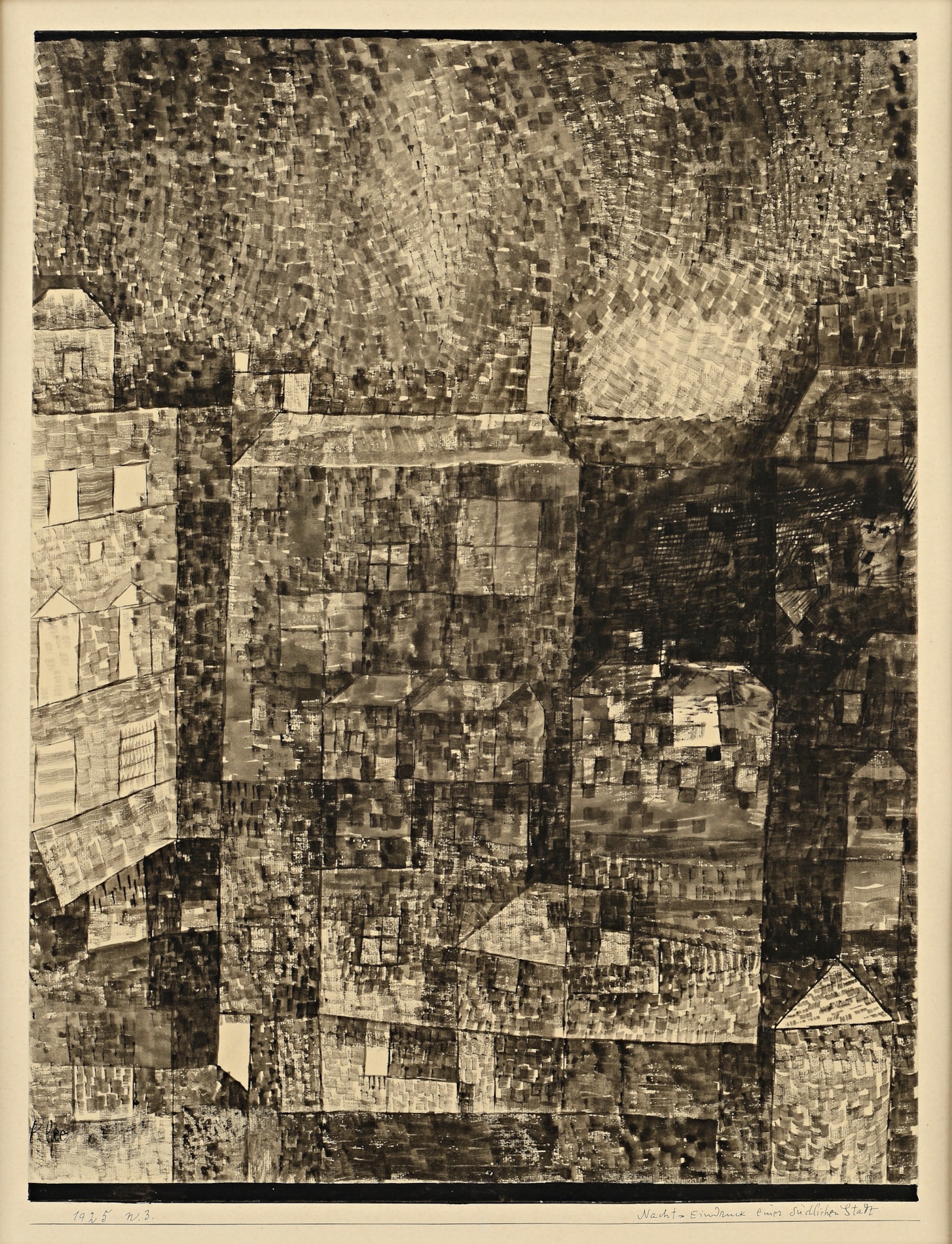 This drawing is dated early in 1925, and must reflect Paul Klee’s memories of his trip to Sicily the previous summer. Colour is extraneous in this nocturnal view of a southern town, which depicts the anonymous village in rich detail, with an arrangement of delicately washed grisaille tones applied in small, tesserae-like blocks verging on pointillism. Although drawn in the artist’s Weimar studio rather than on the spot, the use of a mosaic-like technique in this drawing could well reflect Klee’s exposure to the rich mosaics of the churches of Palermo and nearby Monreale.