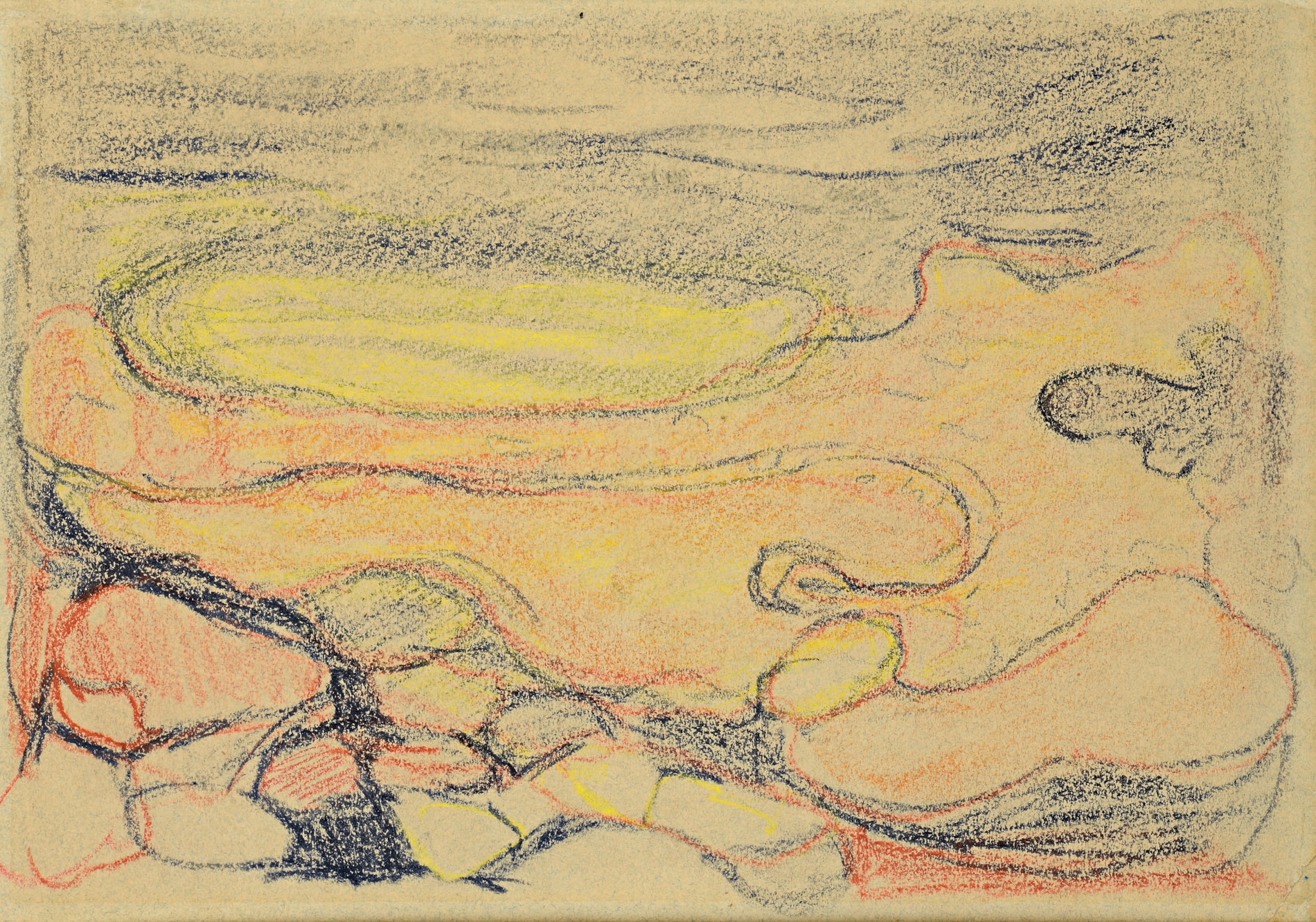 This bold pastel study of rocks or boulders at the water’s edge is likely to have been drawn at the little village of Åsgårdstrand, on the western shores of the Oslofjord, where the beach was strewn with large rocks. The Munch family had a summer house at Åsgårdstrand, which is about a hundred kilometres south of Oslo, and spent vacations there from 1889 onwards. Munch returned to the small fishing village, which also attracted a number of other artists and writers from the capital, almost every summer for twenty years. It was a place to which the artist remained strongly attached, and the curving shoreline and the landscape around Åsgårdstrand were to serve as a constant source of inspiration for his paintings throughout the 1890’s. Ellen Lerberg has noted of Munch that ‘The characteristic shoreline [of Åsgårdstrand] runs like a common thread through many of his pictures, including The Dance of Life and Melancholy.’ Indeed, as Munch himself wrote, after buying a small house in Åsgårdstrand in 1897, ‘To walk around here is like walking among my pictures. I feel such an urge to paint when walking around in Åsgårdstrand.’ After several summers at Åsgårdstrand, Munch came to know the features of its shoreline so well that he could reproduce them, if necessary, in his paintings even when he was away from Norway.