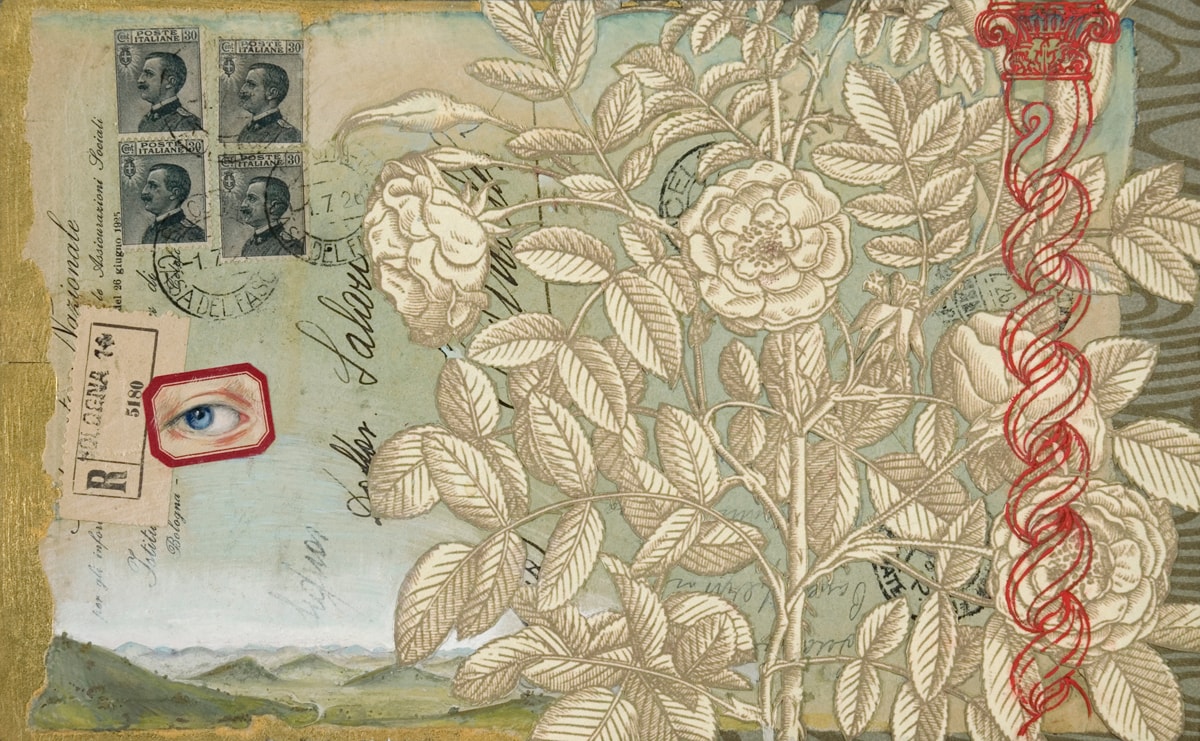 Collage, gold leaf, gouache, and oil on paper mounted on panel