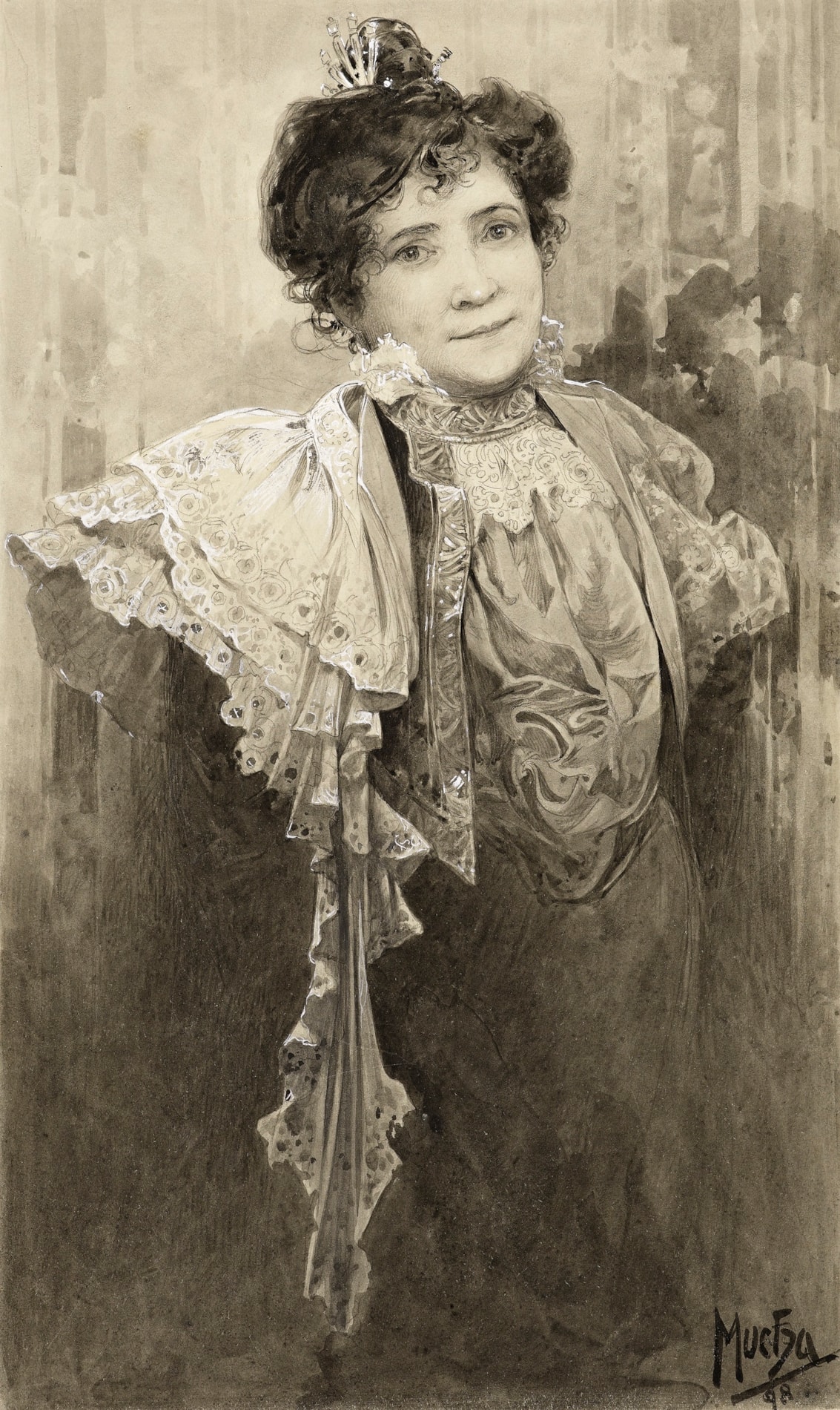 A related pastel drawing of the same sitter by Mucha, also dated 1898, is illustrated in a book published in 1971, where it is tentatively but incorrectly identified as a portrait of Sarah Bernhardt.