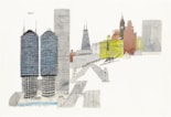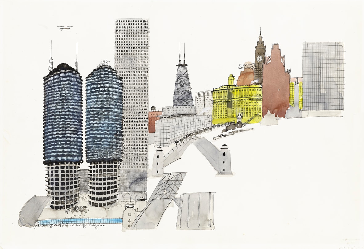 As Spender writes, in the text which accompanies the present drawing, ‘The real and lasting triumph of Chicago is that the area extending a few miles inland from the lake and seven or eight miles along its shore contains a historic anthology of the most splendid architecture in America...But marvelous as certain buildings are, what makes Chicago so impressive is the placing of these buildings near the lake. Once I happened to fly from New York to Chicago on a bright winter day, and from the air the skyscrapers looked like formations of rock crystal glittering in the sunshine and arranged along the edge of a frosted mirror, the frozen and snow-swept lake; beyond these crystal towers the vast gridded lines of black streets and slum houses looked like latticework seen through encrustations of frost magically beautiful. Although one rarely sees it in the sparkling snow-white innocence of that particular morning, Chicago is architecturally successful in setting up great vertical towers near the lake, contrasting with the texture of the water the horizontality of the plains. Although in one of the flattest parts of America, the buildings – just because there is such a concentrated battery – project elevation and suggest, when one is on the ground, views from high up. And if one does go high up, one sees by day the immense luminous shield of the lake laid against the shore of roads and parks and buildings, and by night the endless moving sparkling chains of lights of cars against the lakeside towered over by golden luminous skyscrapers.’
