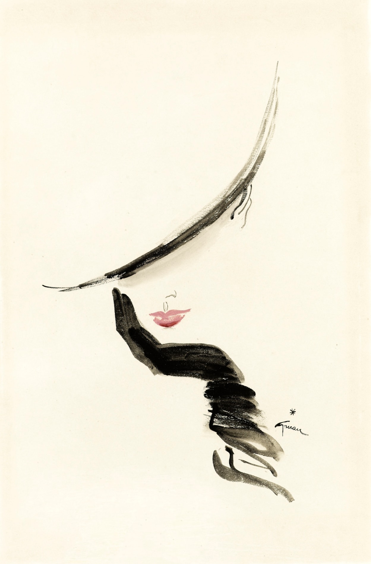 The present sheet may be related to a number of drawings of a similar motif by Gruau which were used as designs for advertisements for Le Rouge Baiser lipstick. Beginning in 1949, Gruau’s spare yet bold drawings of a woman’s face and lips became the iconic images of this famous brand of bright red lipstick, which was celebrated for being indelible or ‘kiss-proof’.