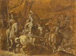 As Eckhard Leuschner has noted, with reference to the present sheet, ‘Among the surviving documentary evidence of Scipione Borghese's Tempesta acquisitions, the Doi disegni oscuri chiari con cornice in carta gialla negra are especially interesting. They must have been pictorial drawings by the artist executed on paper, representing, in their monochromatic composition, the antique bas-reliefs he valued. One – albeit damaged – example of Tempesta’s elaborate technique was on the art market some years ago: on brown paper (probably the above-mentioned carta gialla), one can see a line of mounted soldiers in ‘antique’ armour in the foreground, moving from a small hill towards a battle in the middle and far distance. In its composition the drawing is reminiscent of the etchings of the Alexander series, but this is not a rapid sketch but a highly elaborate drawing by Tempesta. The drawing is not only executed with brown washes and white heightening, but also has various accents in gold, which gives it the impression of something precious, which must have appealed to a collector like Scipione Borghese, who was obsessed with art treasures and kunstkammer objects.’