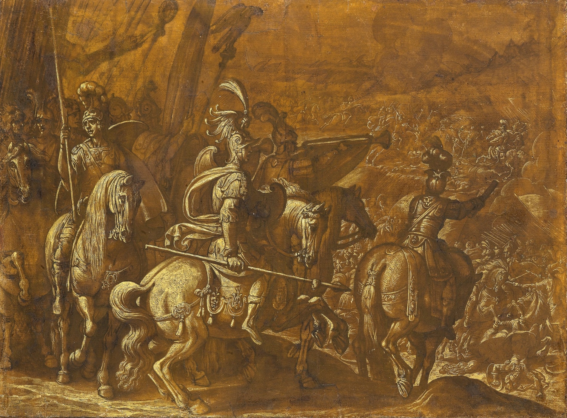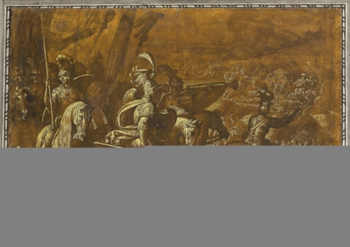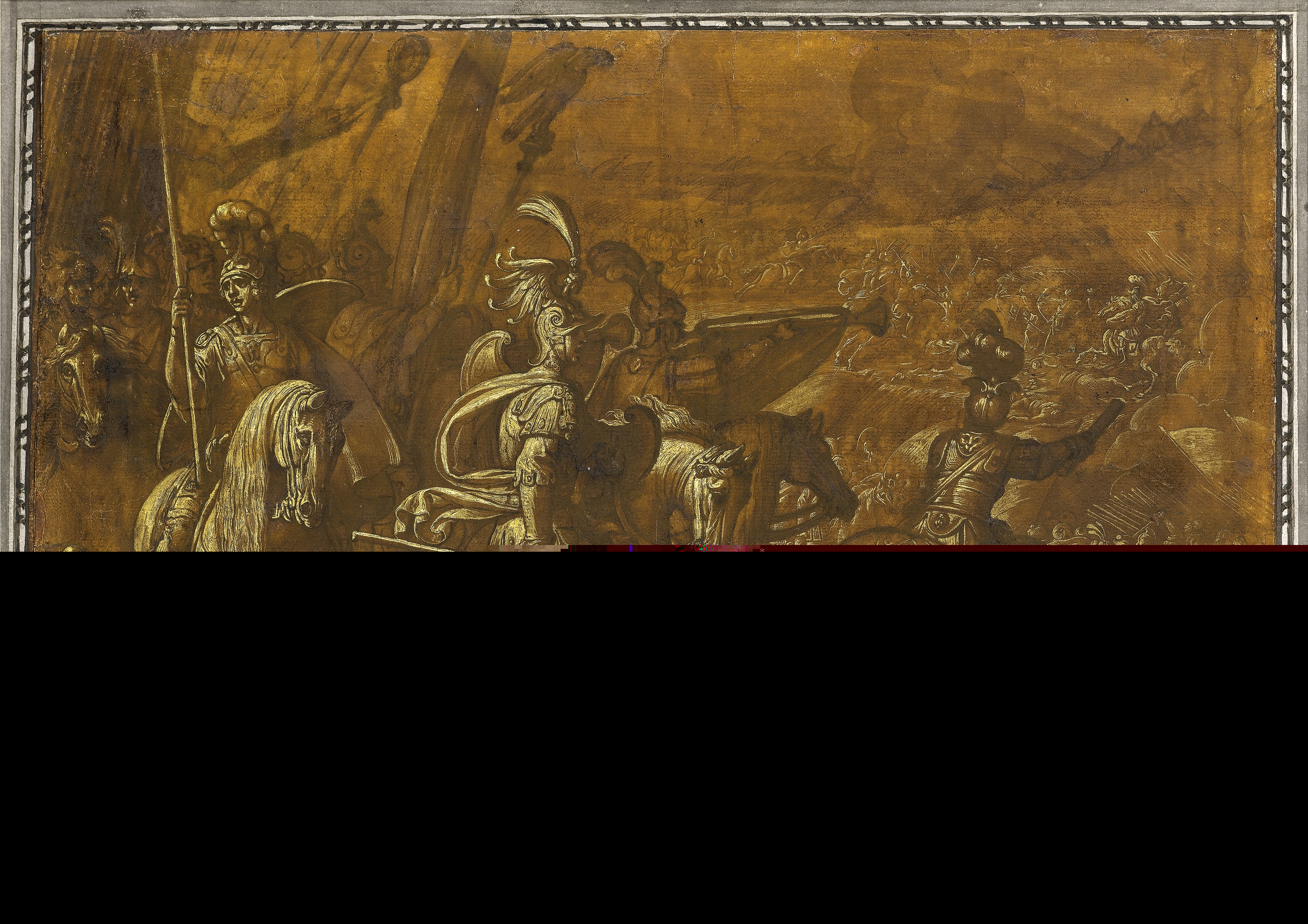 This drawing is unusual among Antonio Tempesta's drawings in its impressive scale and degree of finish. While its composition is similar to such etchings by Tempesta as Alexander the Great Directing a Battle or The Roman Commander Cerialis Attacks near Trier, as well as some of the scenes illustrating Tasso’s Gerusalemme Liberata, this very large sheet - drawn with extensive heightening in gold and with the addition of a fictive mount border - must have been intended as a finished, independent work of art.