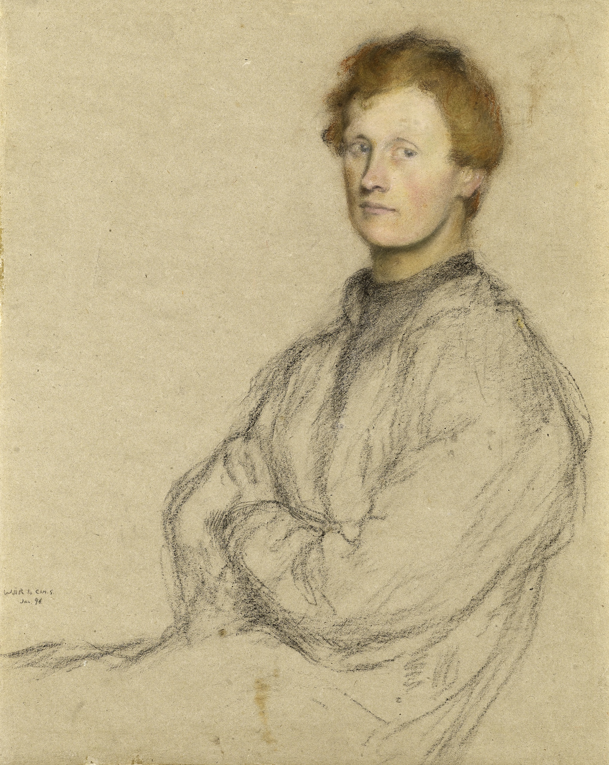 Pencil and coloured chalks on light brown paper.