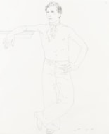 The present sheet, though drawn a few years earlier in 1969, is related to this unfinished painting in the pose of Sleep, who is shown standing with his legs crossed in the same way as in the drawing. Hockney may have referred to the present sheet when he came to develop the pose of Sleep in the painting.
