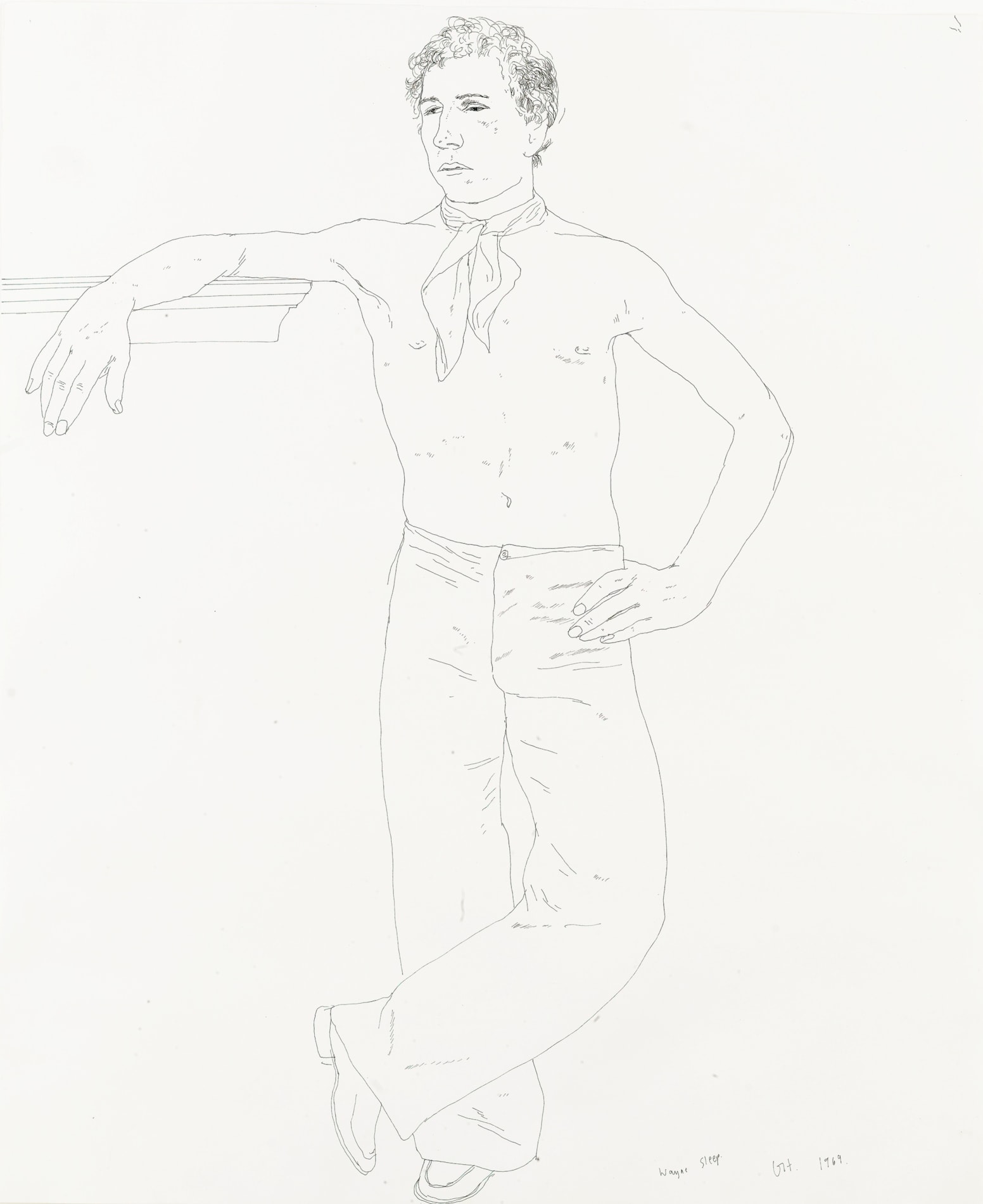 A splendid example of what are among Hockney’s most celebrated works, his pen and ink line portrait drawings, this is a portrait of the dancer Wayne Sleep (b.1948), who has modelled for the artist on several occasions. A principal dancer at the Royal Ballet, Sleep first met Hockney in 1967, a year after joining the company. The two were introduced by Lindy Dufferin, who had arranged for the artist to draw Rudolf Nureyev at the rehearsal studios of the Royal Ballet. Hockney and Sleep became good friends, and the artist was responsible for introducing Sleep to George Lawson, with whom he has since had a long relationship.