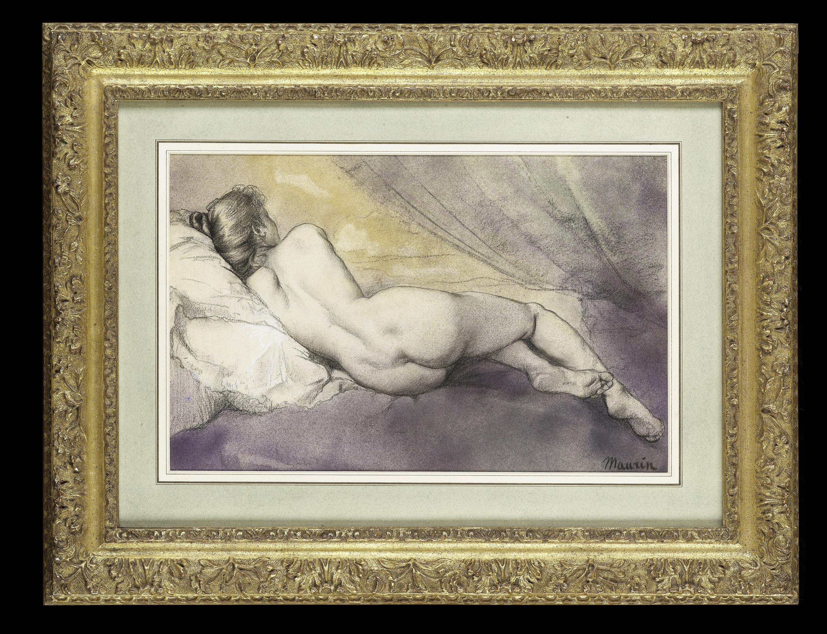 This beautiful and refined drawing is a splendid example of Maurin’s lifelong interest in the depiction of the female nude. Such voluptuous nudes appear in several of his paintings and in many of his prints and drawings. The solitary female nude was, in fact, one of the constant themes of Maurin’s graphic art, and the resulting prints and drawings are among the artist’s most striking and individual works. Like Degas, Maurin was fond of portraying women at intimate moments of their daily routine; ‘The themes of woman at their toilette, dressing, undressing, bathing, drying themselves, brushing their hair, contemplating themselves in front of a mirror are found earlier and less matter of factly in the prints and paintings of Degas and Cassatt.’ As Colin Eisler has further noted, ‘Maurin modernized the voluptuous nudes of the 60’s and 70’s. It was this aspect of his art that so appealed to Degas, who saw Maurin as heir to Ingres’s mastery of the nude.’