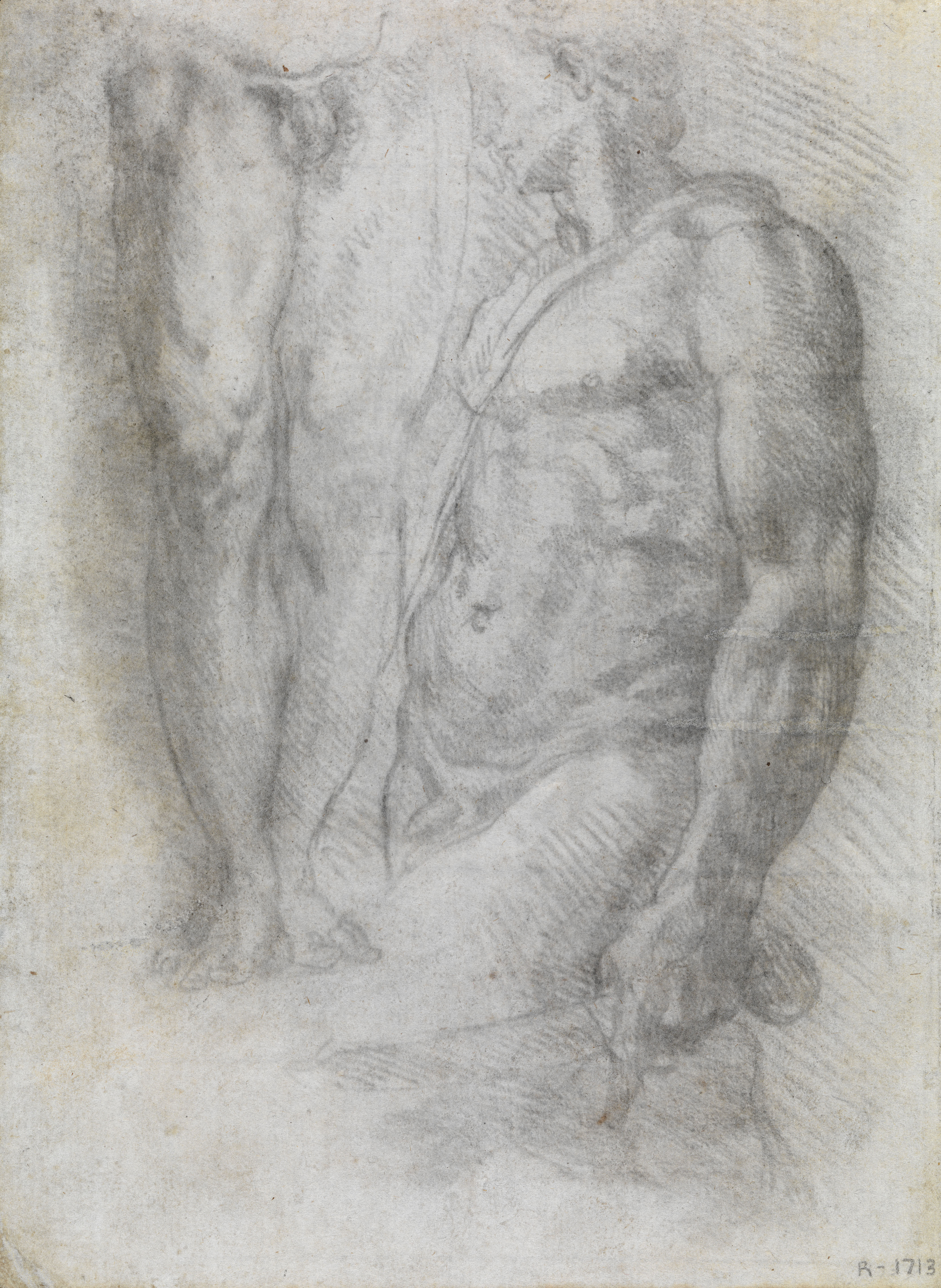 This interesting sheet of studies would appear to be after an Antique or Renaissance sculpture, and indeed the position of the legs in this drawing is very close to the Hellenistic sculpture known as the Dancing Faun in the Uffizi. Although the first written reference to the sculpture dates from 1665, there is some evidence that it may have been known as early as the middle of the 16th century. Cherubino has here altered the pose of the figure to become David standing atop the severed head of Goliath.