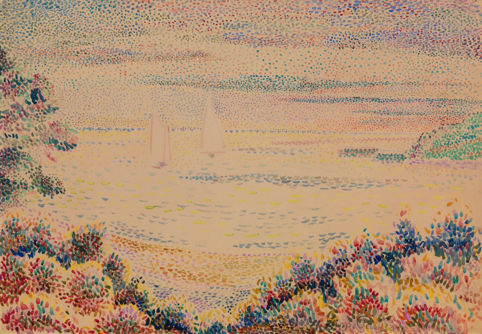 A closely comparable pointillist watercolour of sailboats in a bay by Petitjean, of similar dimensions to the present sheet and signed in the same way, is in the collection of the National Gallery of Canada in Ottawa.