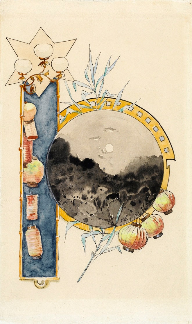 A Circular Landscape, Surrounded by Oriental Lanterns and Motifs