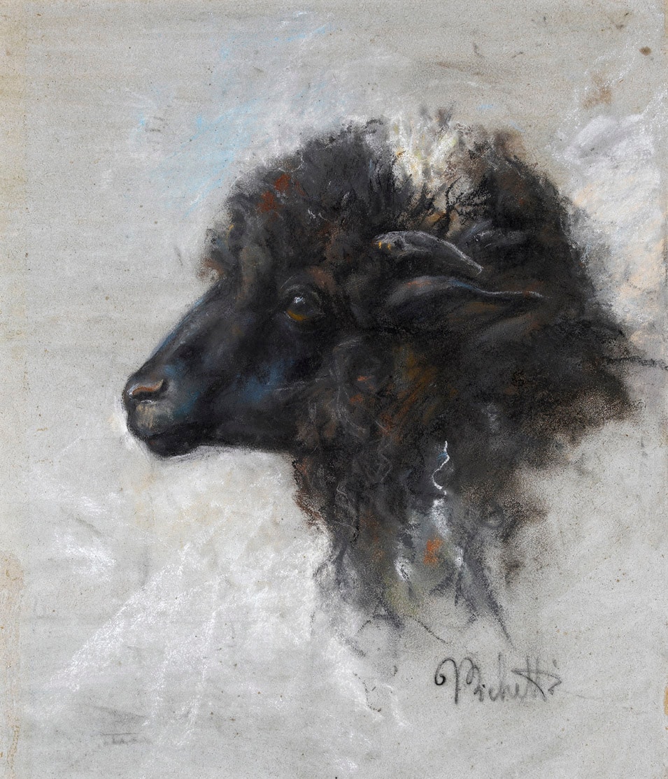 Sheep, goats and other animals appear in several of Michetti’s paintings of pastoral subjects in the 1880’s and 1890’s. The present sheet, executed with the artist’s characteristic bravura handling of a combination of pastel and gouache, may be compared stylistically with a large sheet of studies of goats in pastel, datable to 1886, in a private collection. Between 1895 and 1900 Michetti also made several photographs of sheep and goats, which he may also have used as preparatory studies for paintings.