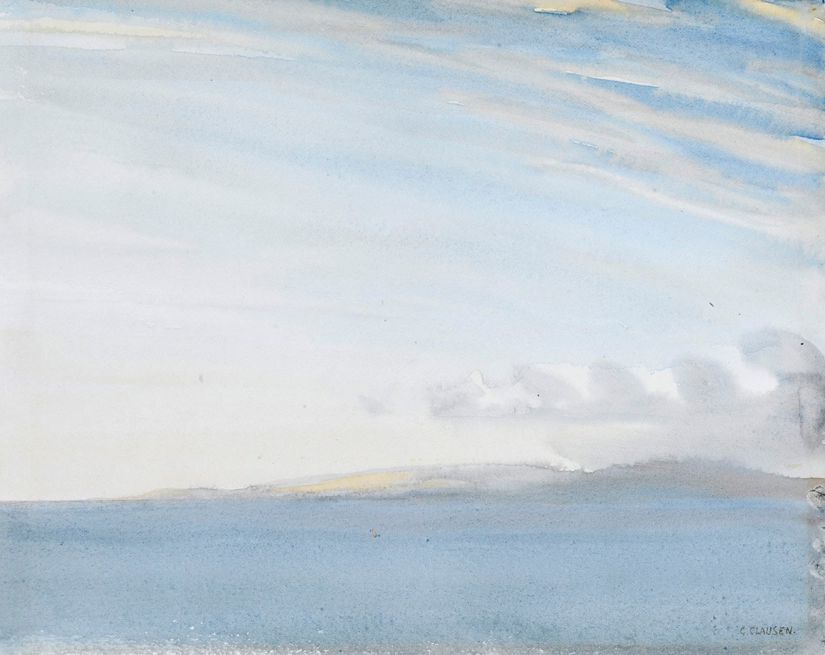 As a watercolourist, George Clausen produced both landscape studies and smaller variants of his oil paintings. He showed regularly at the Royal Watercolour Society, and in 1921 exhibited forty-one of his watercolours at the Grosvenor Gallery. Indeed, in the latter part of his career watercolours came to dominate his output. Writing in 1930, Clausen noted of his technique that ‘I try to work as simply and directly as possible in water-colour…I try (though, of course, I can seldom do it) to put the colour on in one wash, without re-touching, for I think there is nothing so beautiful as a clean tint in water-colour that is exactly right. And even if it does not exactly run into the right place (for water-colour is a tricky medium) the quality of the colour has something of the spontaneity and effortless rightness that one finds in Nature itself – a quality that is always lost by labouring and stippling a drawing...It seems to me that water-colour painting depends more on simplicity of method than oil-painting, and this means, of course, that you must know pretty well what you are want to do before you begin.’