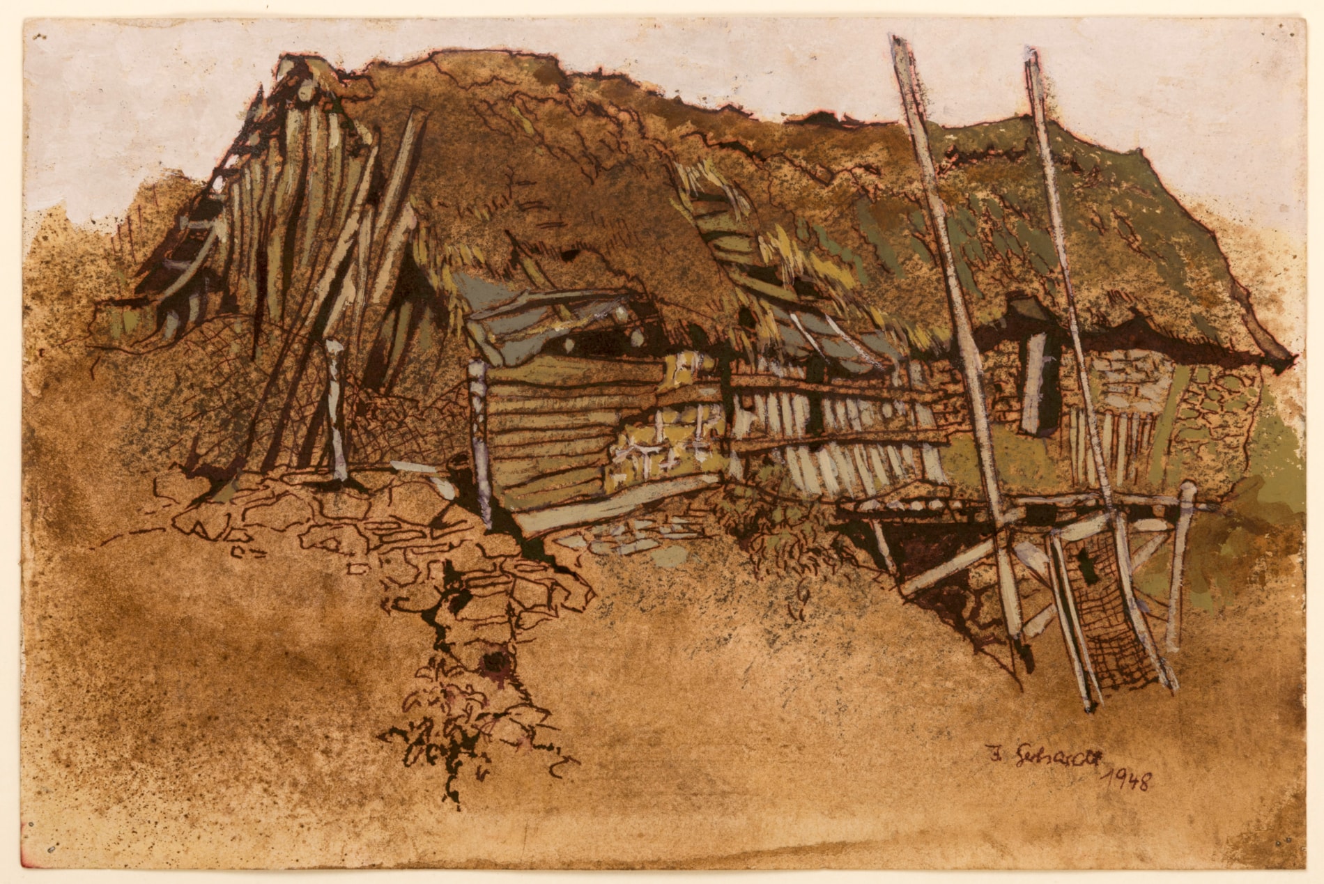 Almost nothing is known of the German artist Ingrid Gerhardt, who does not seem to appear in any biographical dictionaries of 20th century artists. She studied at the free art school established by the painter Jo Strahn in Düsseldorf in the 1940’s. Gerhardt lived and worked for much of her later life in France, in the département of Ille-et-Vilaine in Brittany. That she was also active as a printmaker is evidenced by an illustration of a woodcut of a puppet-master, published in the newsletter of a German amateur theatrical society in 1955.