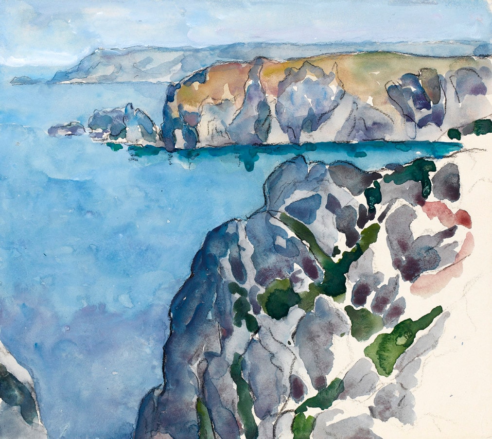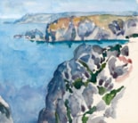 Andrée Lavieille worked often in Brittany, where she and her family would spend most summer holidays beginning in the 1920’s. A comparable watercolour view of the headlands of Castelmeur and Brézellec on the Breton coast is illustrated in a recently published biography of the artist.