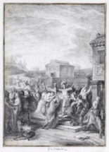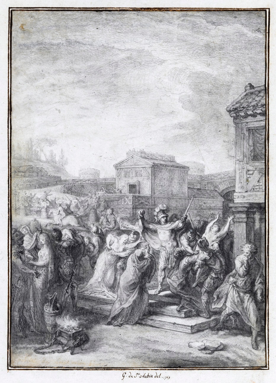 This is a preparatory study by Gabriel de Saint-Aubin for an engraving used to illustrate Philippe de Prétot’s monumental history of ancient Rome, the Spectacle de l’histoire romaine, depuis la fondation de Rome, jusqu’à la prise de Constantinople par Mahomet II, l’an de J.C. 1453, published in 1776 and 1777. The drawing appears, in reverse, as the second plate in the book; reproduced in an engraving by the printmaker Pierre Aveline. Philippe de Prétot commissioned Saint-Aubin to provide drawings or painted designs for twenty-nine of the forty-four illustrations for the Spectacle de l’histoire romaine, with the remainder of the scenes designed by Charles Eisen, Hubert François Gravelot and other artists. Given by far the largest share of the commission, Saint-Aubin worked on the project for much of the 1760s; between 1760 and 1768. His illustrations were engraved by Aveline and, among others, Pierre-François Tardieu, Pierre Chenu and Saint-Aubin’s younger brother Augustin.