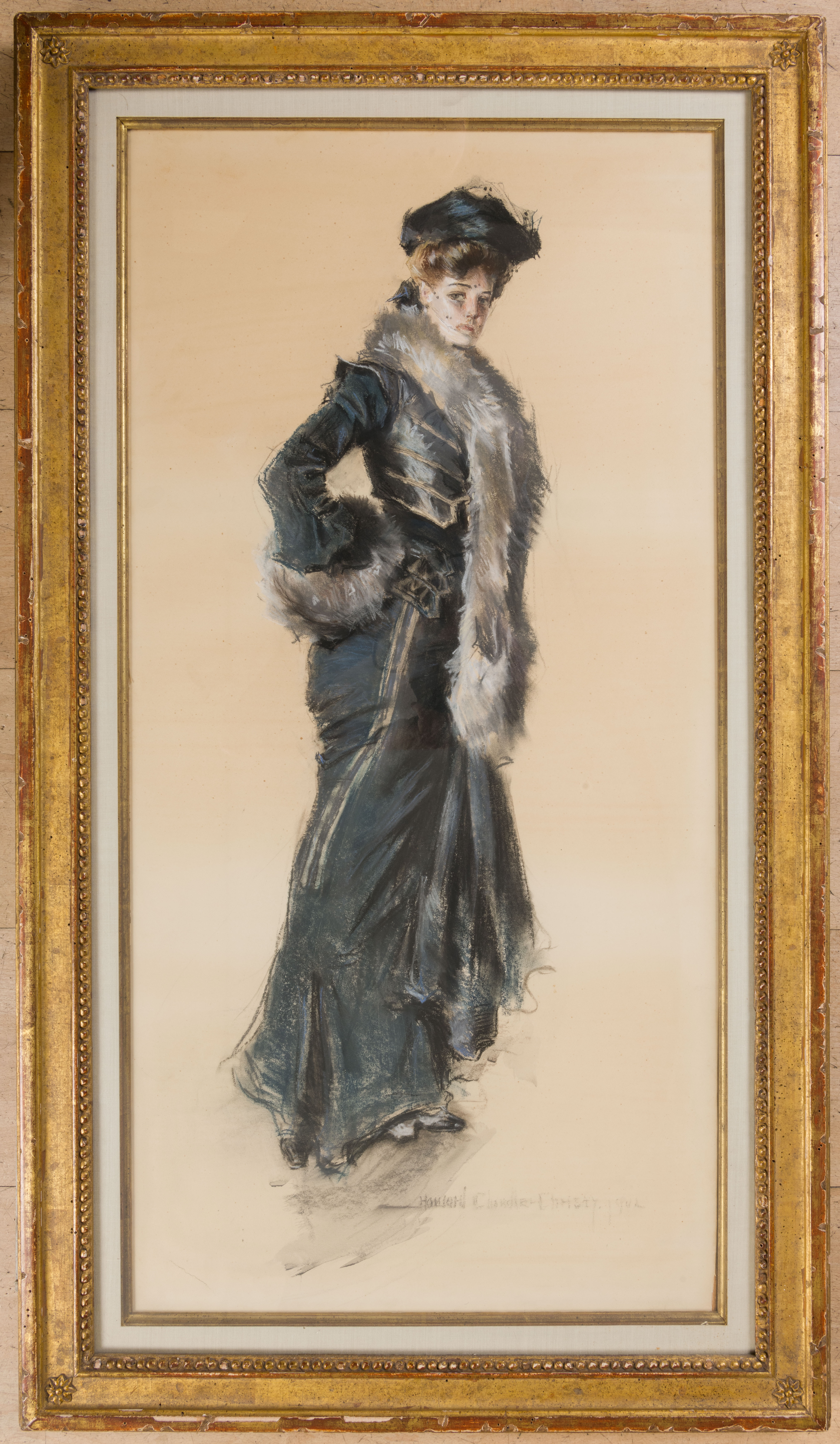 This large drawing, executed in 1902, is a splendid example of the depictions of young American women with which Christy established his reputation. This ideal of feminine youth and beauty, which came to be known simply as the ‘Christy Girl’ - and for which hats, shoes and dresses were also named – was a type described by the artist as ‘high bred, aristocratic and dainty though not always silken-skirted; a woman with tremendous self-respect.’