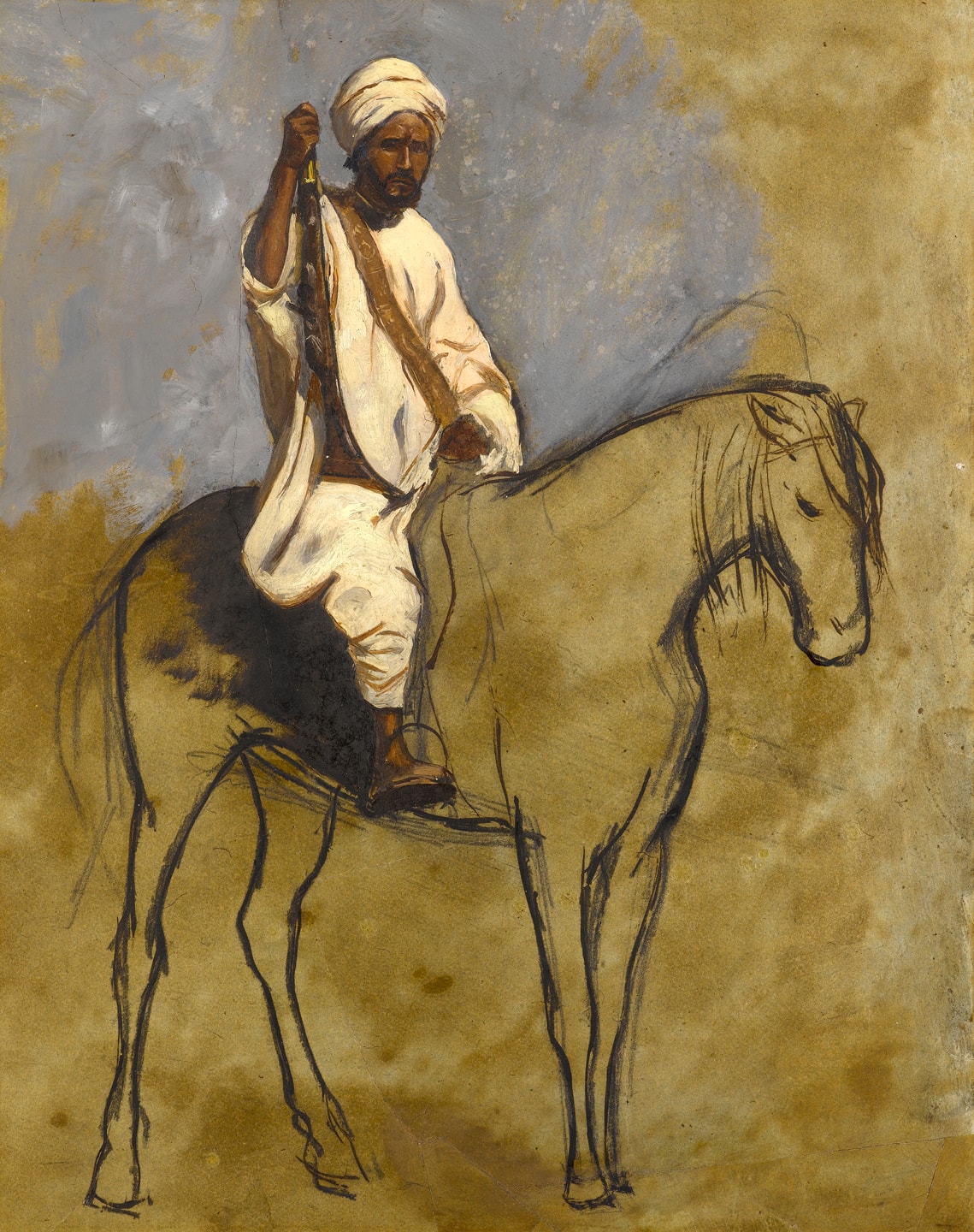 A preparatory study for a figure in Edwin Lord Weeks’s early painting The Departure from the Stronghold, painted in Morocco and formerly in the collection of the American artist Chester Hicks Loomis.