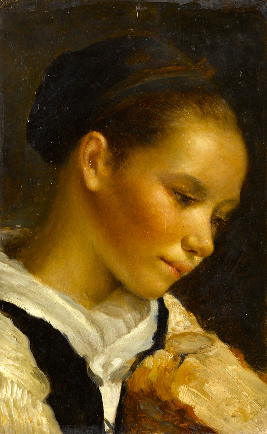 The same young model seen in this oil sketch may have posed for d’Estienne’s genre painting The Doting Mother, which appeared at auction in London in 1986.