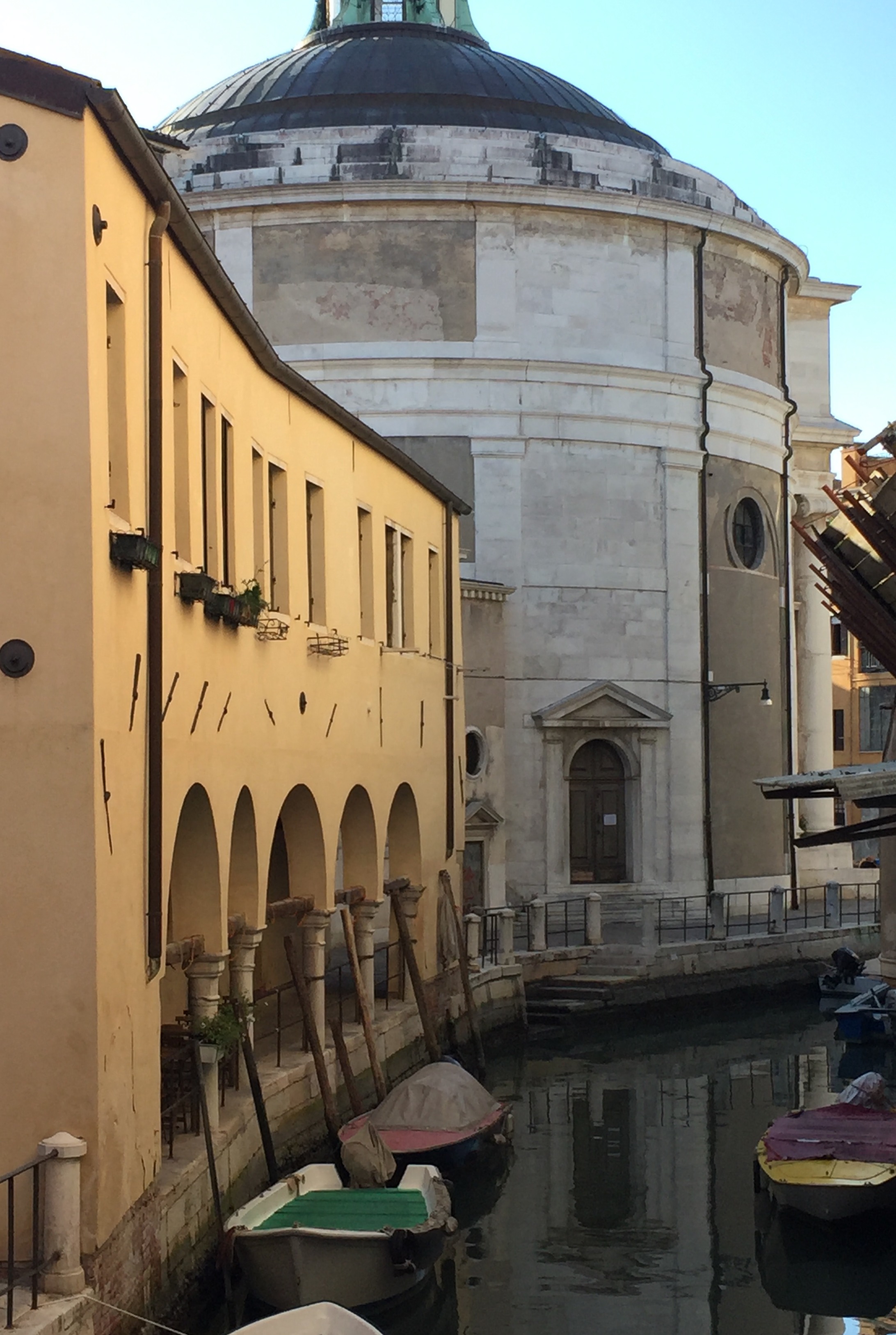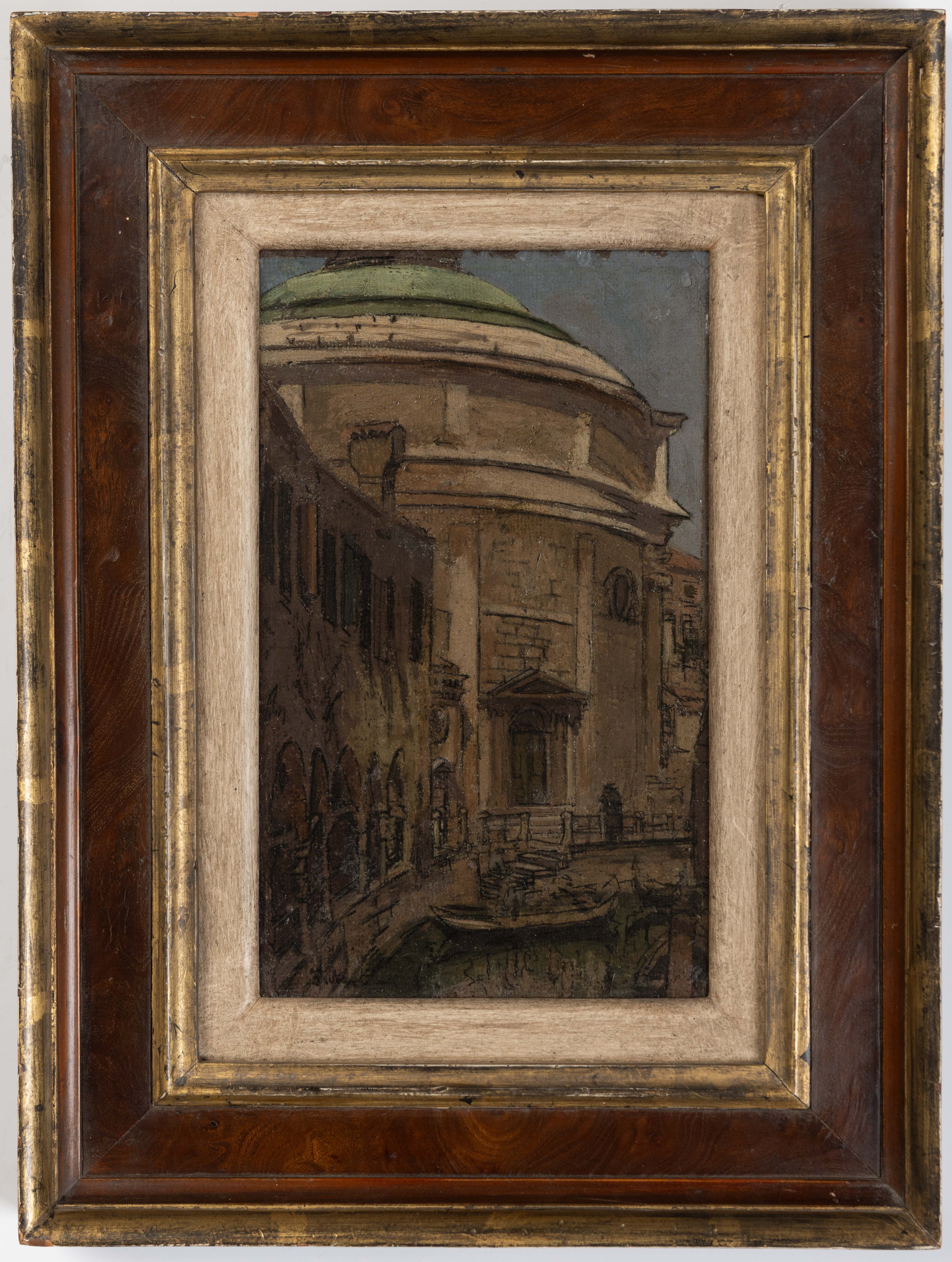 Probably datable to Sickert’s first lengthy stay in Venice, in 1895-1896, this oil sketch depicts the small domed Neoclassical church of Santa Maria della Maddalena (usually referred to by Venetians simply as ‘La Maddalena’), with the Fondamenta delle Colonnette at the left. Sickert drew this sketch while standing on the small Ponte Correr, which crosses the Rio della Maddalena, just behind and to the southeast of the church. (A contemporary photograph of the same view is shown here.) Built around 1760 by the Venetian architect Tommaso Temanza on the site of an earlier, 13th century church, Santa Maria Maddalena has a circular plan inspired by the Pantheon in Rome. Set back in a small campo in a relatively isolated part of the Cannaregio district of Venice, it is one of the few completed buildings by Temanza, who was primarily an architectural historian and biographer. The church of the Maddalena is his most famous work, and the architect, who died in 1789, is buried there. The church has a very beautiful interior, but is usually closed.