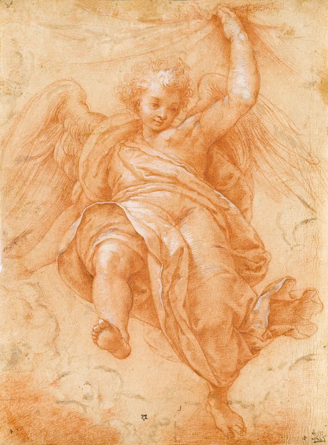 Calvaert was a prolific and talented draughtsman, and many of his drawings are dated or can be connected with surviving paintings. The present sheet would appear to be a preparatory study, with some differences, for the angel which appears at the lower right of an altarpiece of The Assumption of the Virgin, datable to around 1569-1570. Formerly the high altar of the Bolognese church of Santa Maria degli Angeli, the painting is today in the Pinacoteca Nazionale in Bologna. Although the angle of the head and position of the torso of the angel in the painting are slightly different from the figure in the drawing, the position of the legs and the upraised arm is identical.