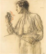 Black chalk, with touches of red chalk, red and green watercolour, and white heightening on buff paper, laid down on card.
