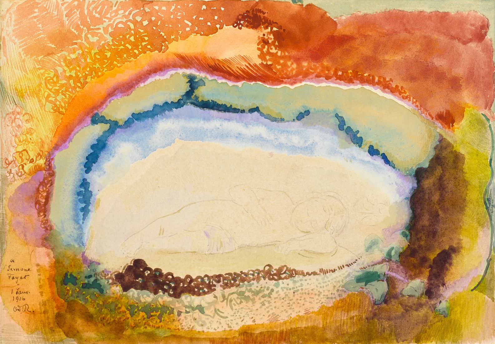 This extraordinary watercolour, which was given by Odilon Redon to Simone Fayet (1899-1961), the eldest daughter of his friend and patron Gustave Fayet, on New Year’s Day of 1916. A painter, collector and museum curator, Gustave Fayet (1865-1925) was a champion of several modern artists in the late 19th and early 20th centuries, in particular Gauguin and Redon. He owned over a hundred works by Gauguin and also collected many works by Redon, mainly from 1908 onwards. Fayet first met Redon in 1900, and in 1910 he commissioned two large murals from Redon to decorate the library of the Cistercian abbey of Fontfroide, near Narbonne, which Fayet had purchased and begun restoring in 1908.
