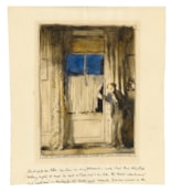 As Bruce Arnold has written, with particular reference to the present sheet, ‘It would be hard to describe the letters which Orpen wrote to [Mrs. St. George] as ‘love letters’...In all, 365 letters, fragments of letters and drawings have survived. An overall judgement cannot be made, since in many cases the text has been cut away, leaving only a drawing surrounded by tantalising but unintelligible morsels of prose. The general tone is of warmth, friendship and intimacy, with only occasional overtones of romance. It was a loving friendship...There are curious, sad fragments. When he was in Huddersfield, painting a portrait of a Miss Lumb, he sent to Mrs St George a ‘Window Picture’, small, and in sepia and blue wash. In composition it is like the series involving Grace. But Orpen stands with his finger to his lips, holding back the curtain to show the sky. And he has written: ‘When the living sleep and the dead awake...’ He shares in this and other moments his more intimate feelings with mistress rather than wife.’