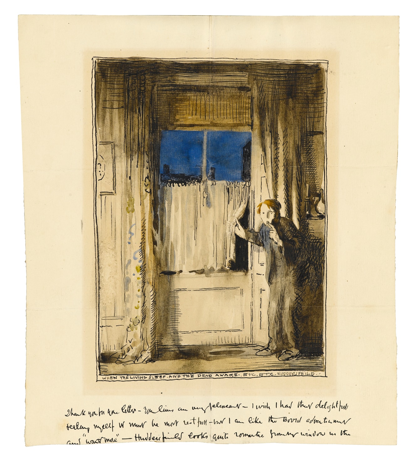 Further inscribed by the artist ‘Thank you for the letter – your lines are very pleasant – I wish I had that delightful / feeling myself it must be most restfull – but I am like the Bovril advertisement / and “want more” – Huddersfield looks quite romantic from my window in the -’ in the lower margin.